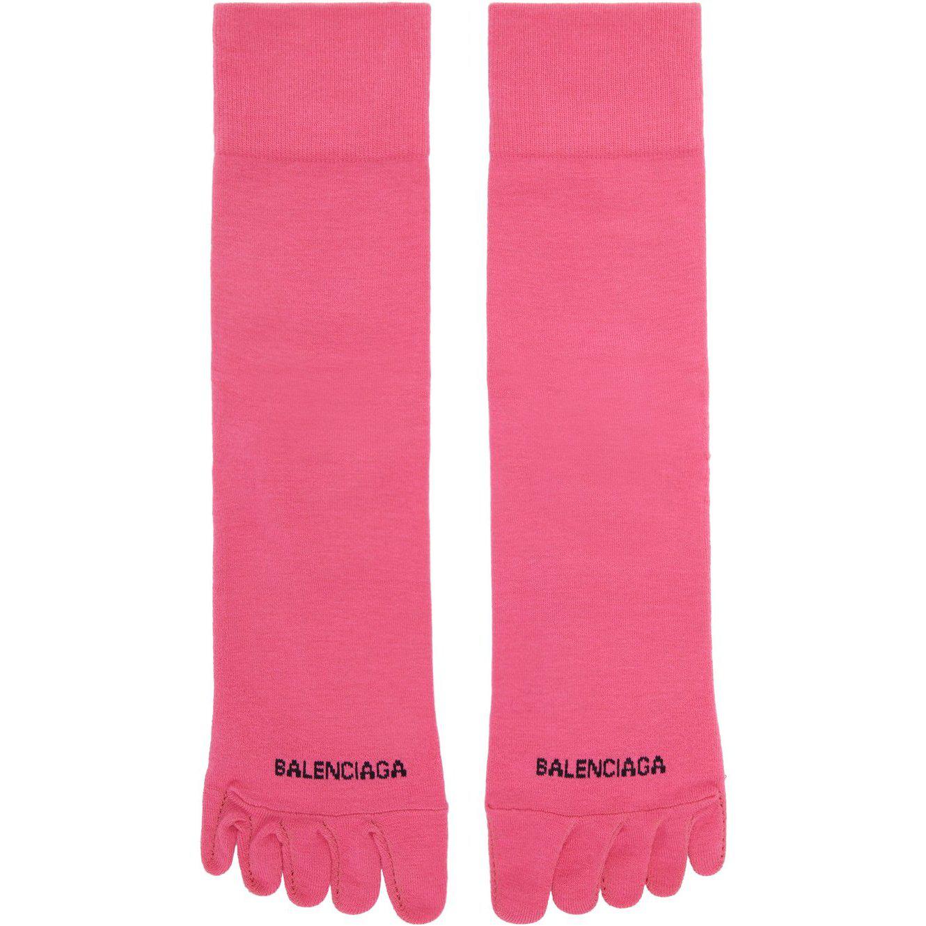 Calf-high cotton and nylon-blend socks in pink. Articulated toes. Logo knit in black at vamp. Rib knit cuffs. Supplier color: Fuschia/Black 46% cotton, 21% acrylic, 20% polyester, 10% polyamide, 3% elastane. Brand: Balenciaga
