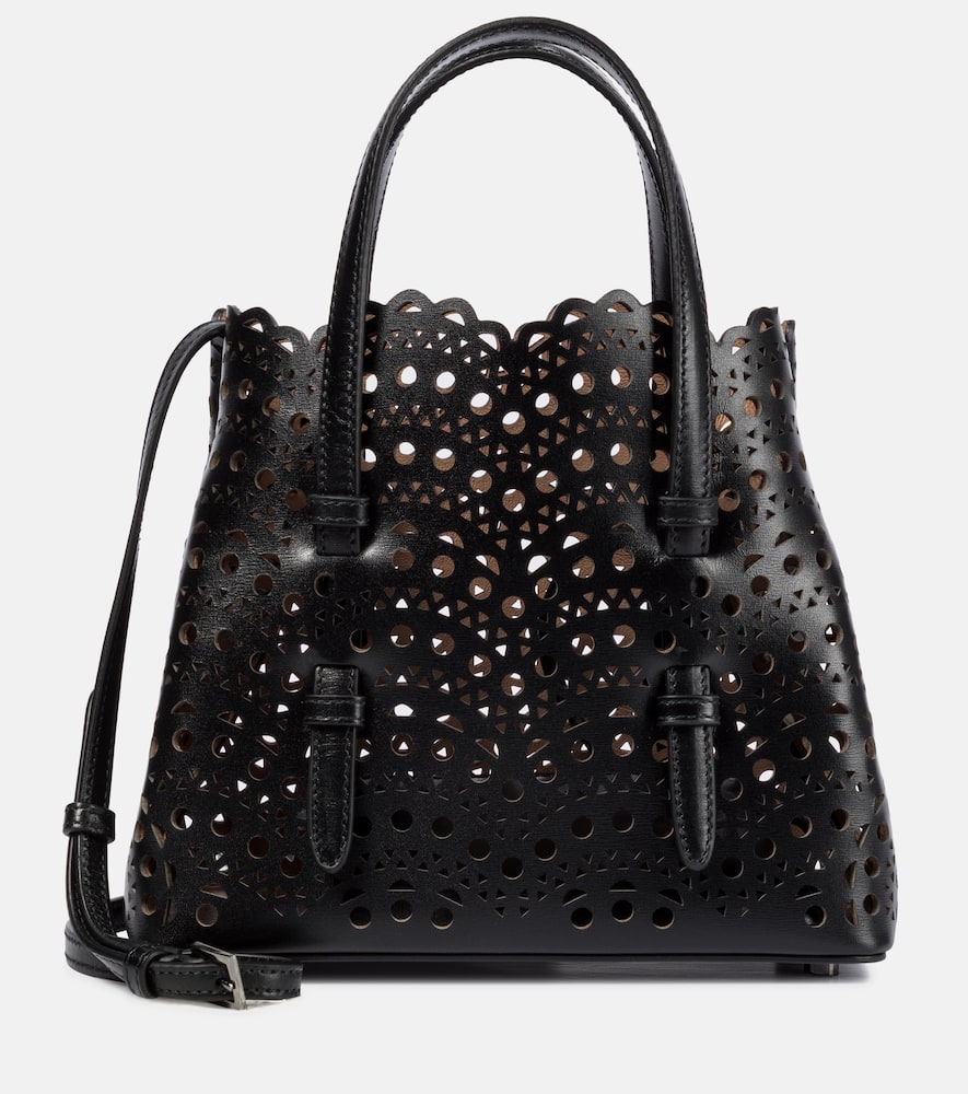 Material: calf leather. Lining: unlined. Made in Italy. Designer color name: Noir. Detachable, adjustable shoulder strap, Top handles. Internal details: internal zipped pouch. Color of fastening: anthracite. Closure: open top. Protective feet. Includes: dust bag. Shop the latest Alaia Top-Handle Bags for women now.