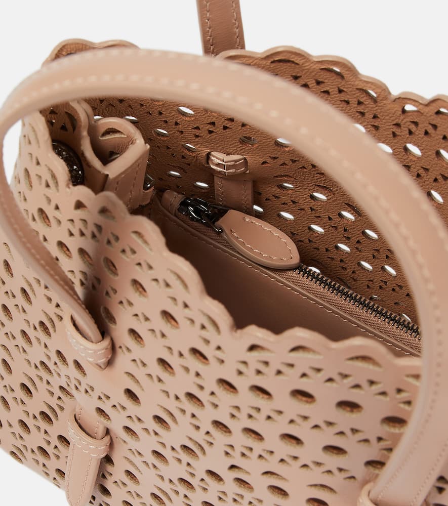 Material: calf leather. Lining: leather. Made in Italy. Designer color name: Sable. Detachable, adjustable shoulder strap. Internal details: internal zipped pouch, leather lining. Closure: open top. Shop the latest Alaia Top-Handle Bags for women now.