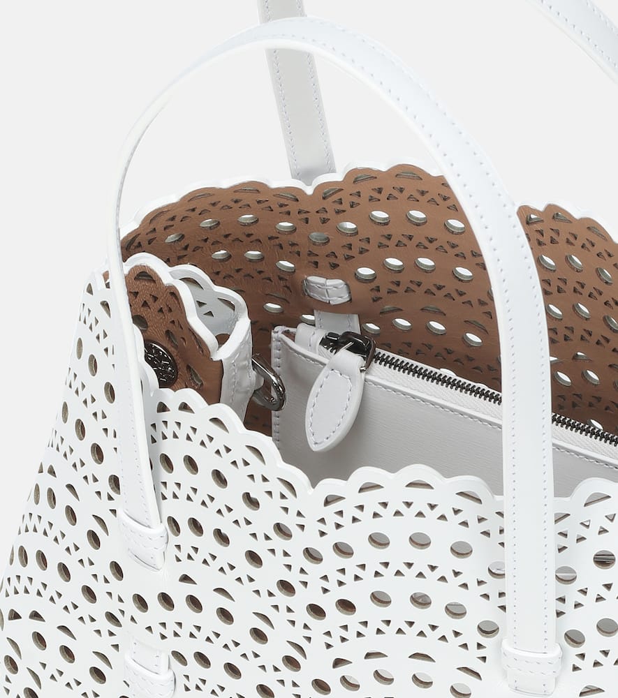 Material: calf leather. Lining: leather. Made in Italy. Includes: dust bag. Designer color name: Blanc Optique. Closure: snap-buttoned fastening. Detachable zipped pouch. Detachable, adjustable shoulder strap, Top handles. Color of fastening: anthracite. Shop the latest Alaia Top-Handle Bags for women now.