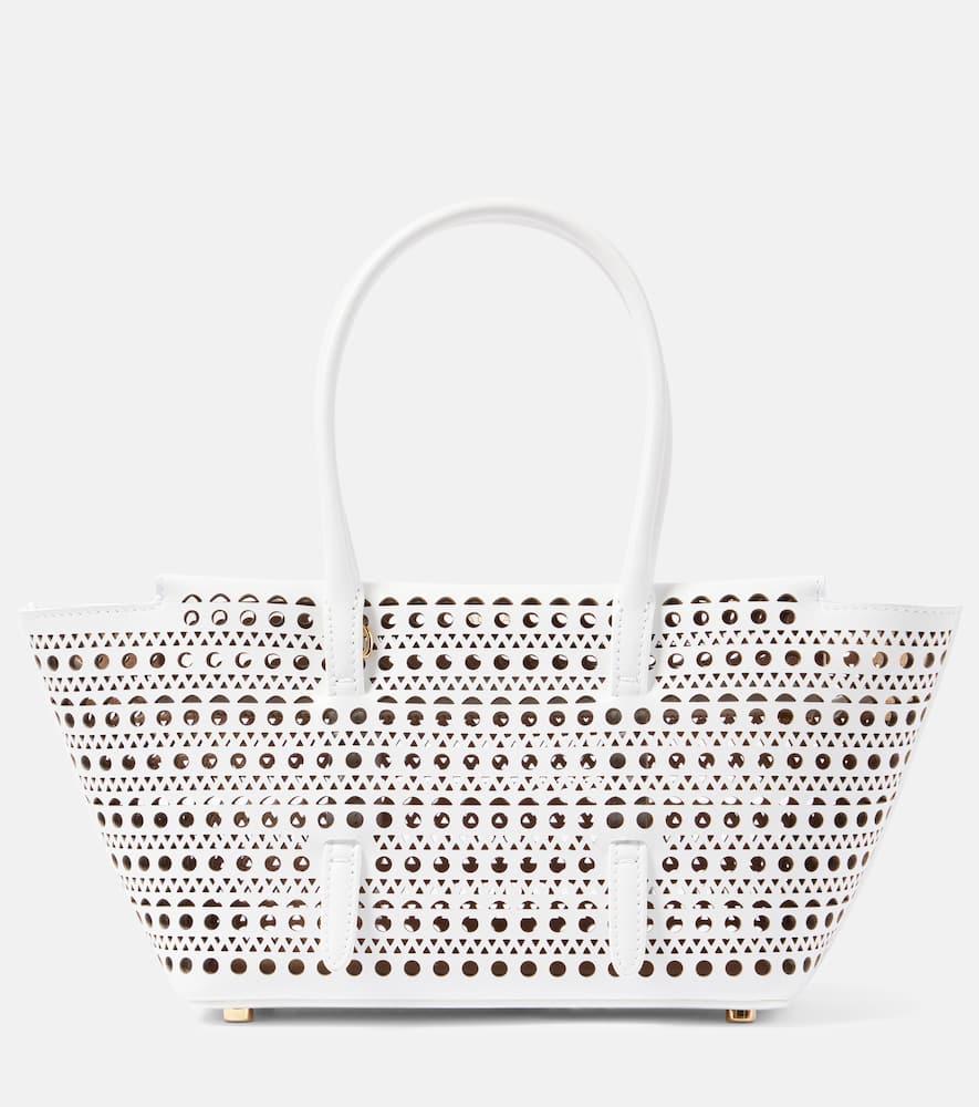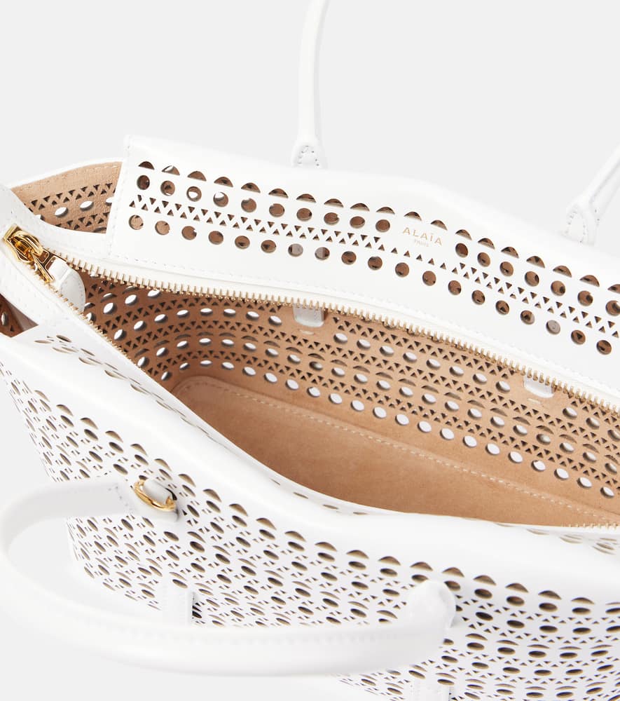 Material: leather. Lining: unlined. Made in Italy. Designer color name: Blanc Optique. Closure: zipped top. Top handles, Detachable, adjustable shoulder strap. Includes: dust bag. Shop the latest Alaia Top-Handle Bags for women now.