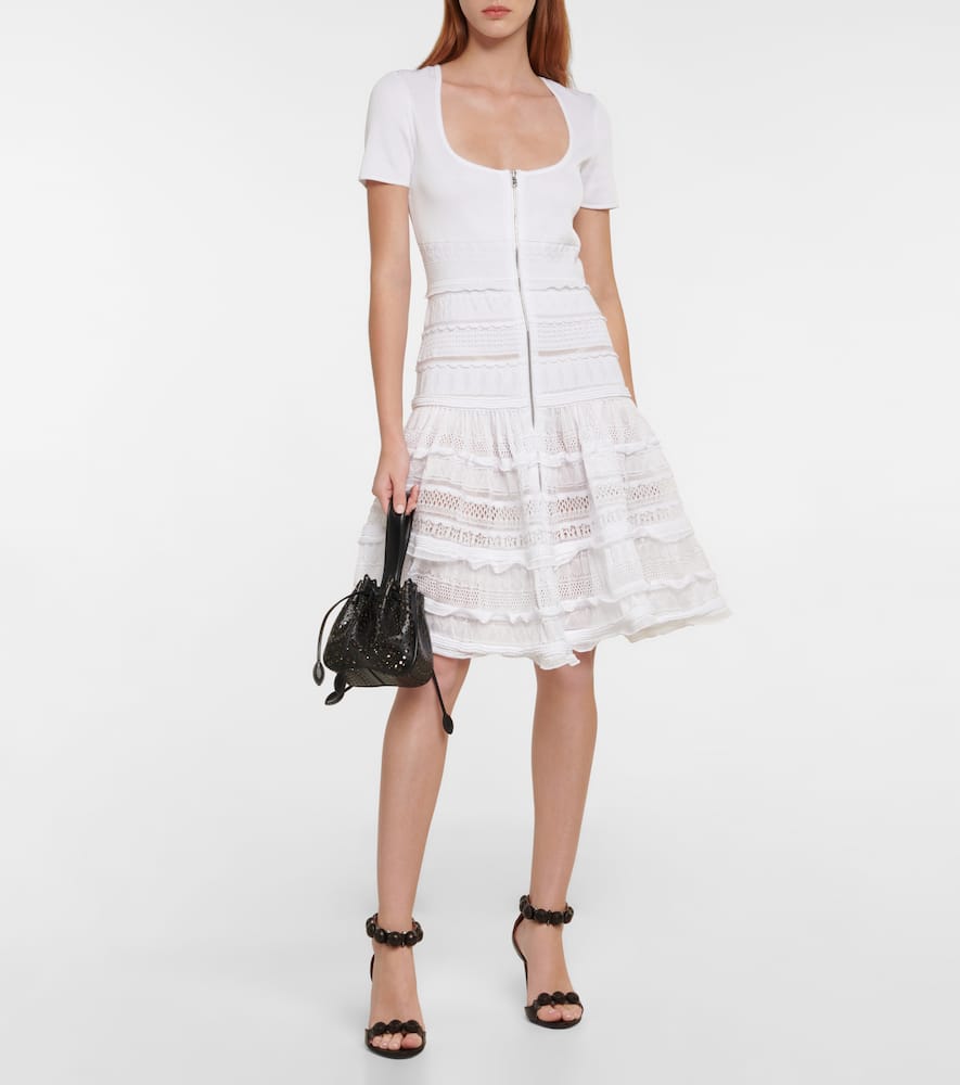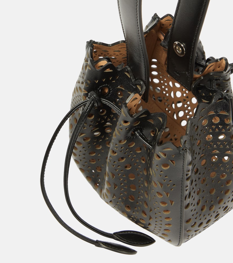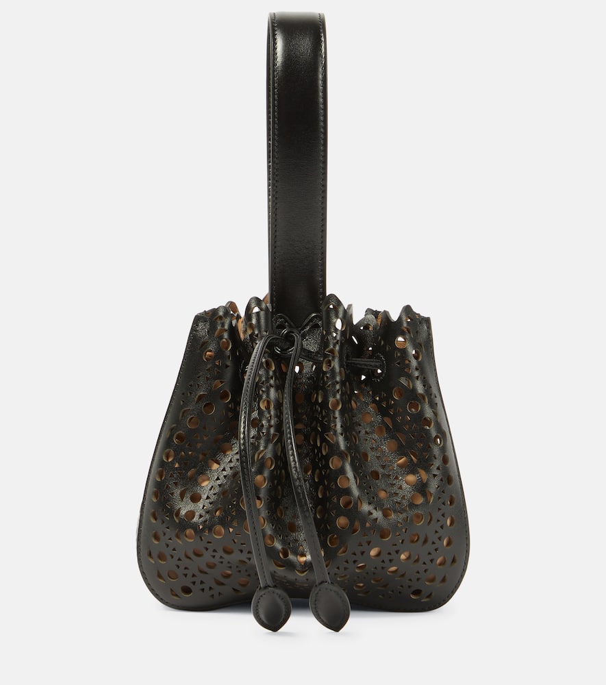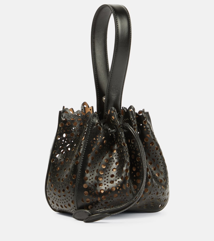 Material: leather. Lining: leather. Made in Spain. Designer color name: Noir. Top handle. Closure: snap-buttoned fastening, drawstring top. Color of fastening: silver. Internal details: leather lining. Includes: dust bag. Shop the latest Alaia Top-Handle Bags for women now.