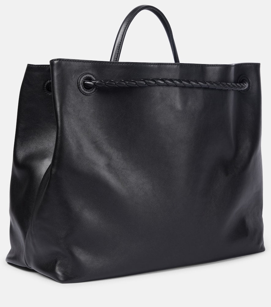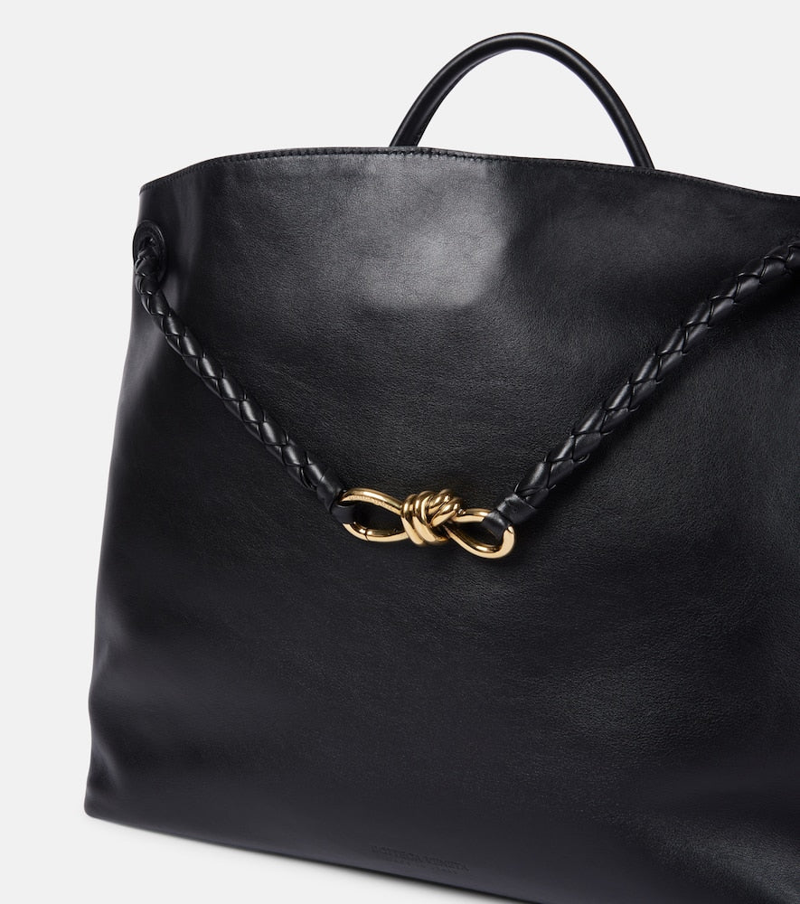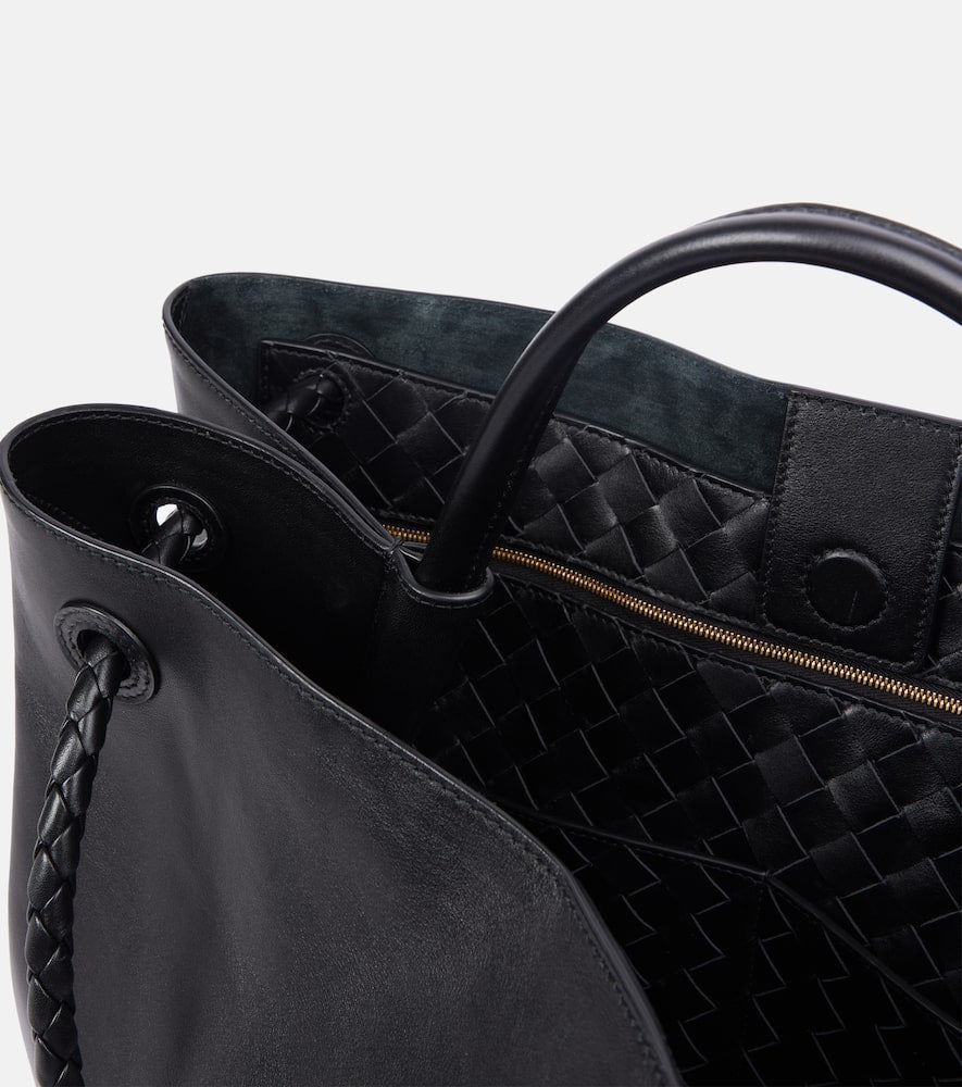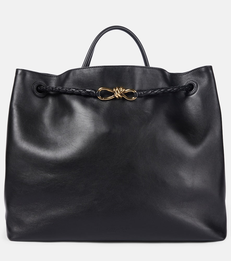 Material: leather. Lining: calf leather. Made in Italy. Designer color name: Black-M Brass. Top handle, Adjustable shoulder strap. Internal details: internal slot pockets, internal zipped pocket. Closure: magnetic-tab fastening. Shop the latest Bottega Veneta Tote Bags for women now.