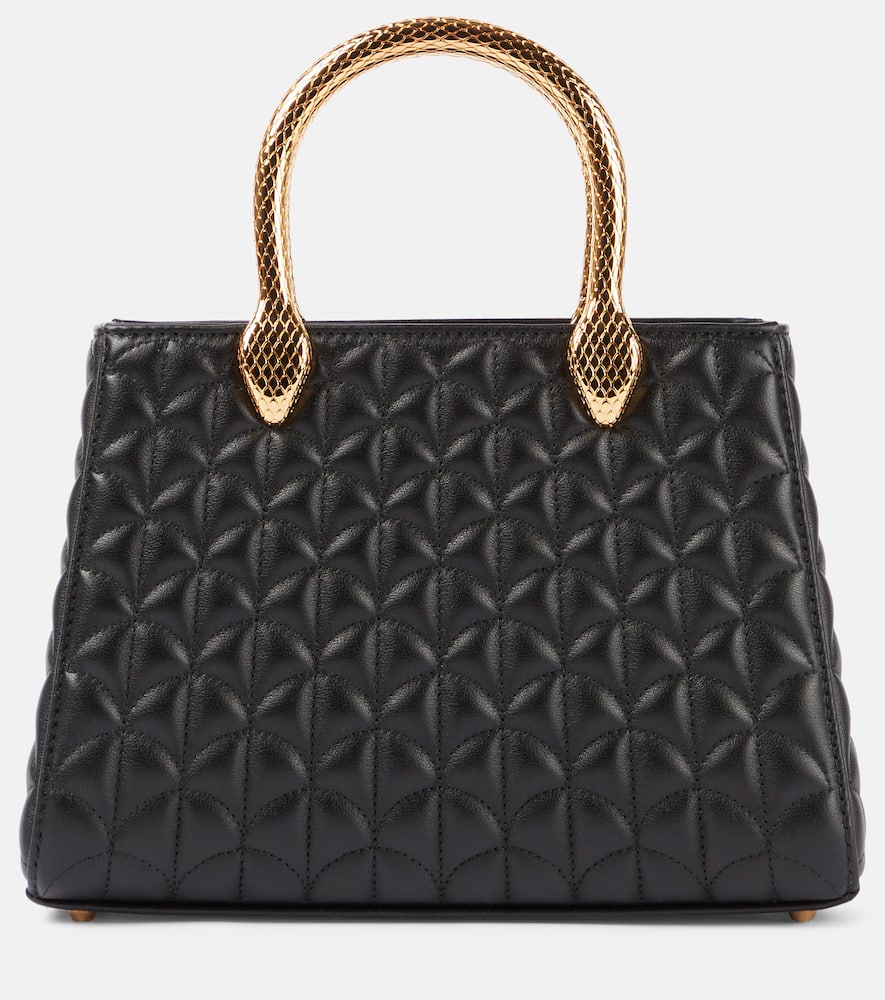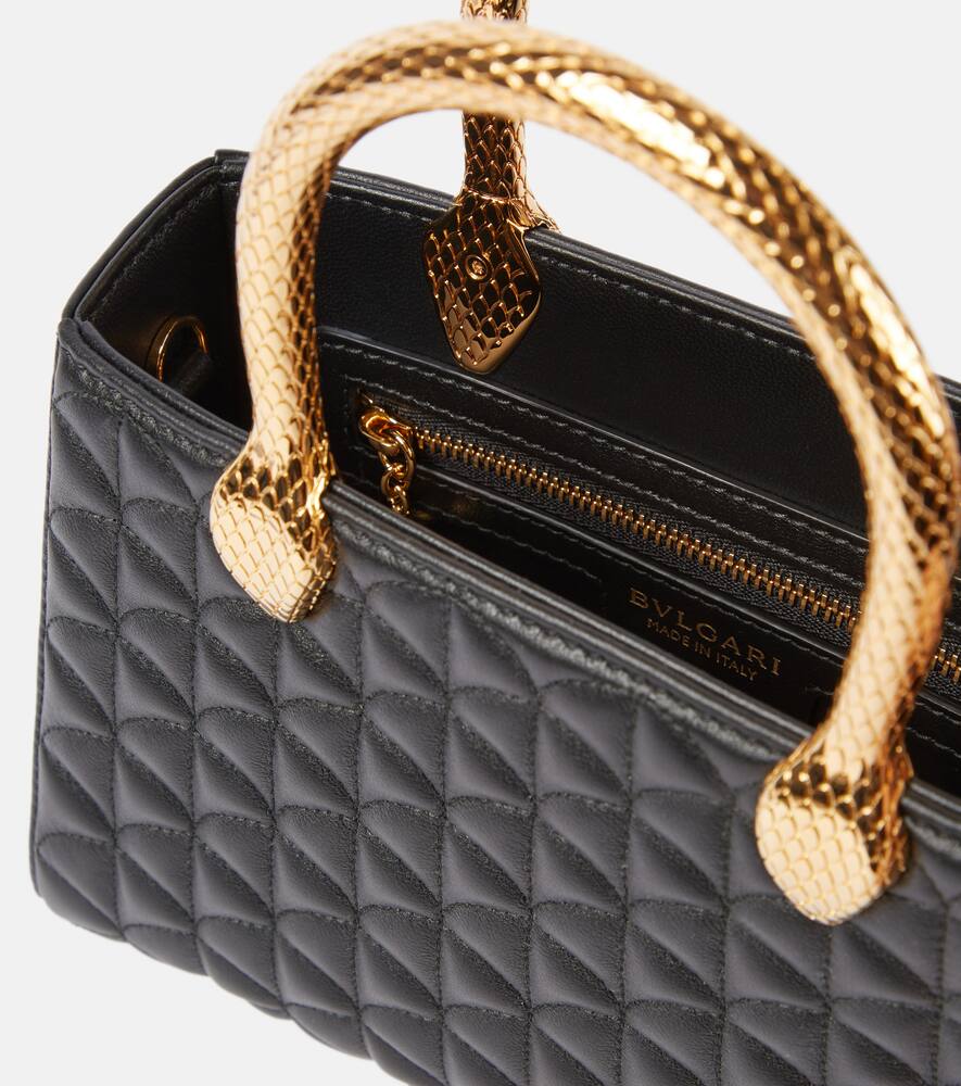 Material: calf leather. Lining: leather (nappa). Made in Italy. Designer color name: Black. Internal details: single compartment, internal zipped pocket, internal slot pocket. Top handles, Detachable, adjustable shoulder strap. Closure: open top. Hardware color: gold. Shop the latest Bvlgari Top-Handle Bags for women now.