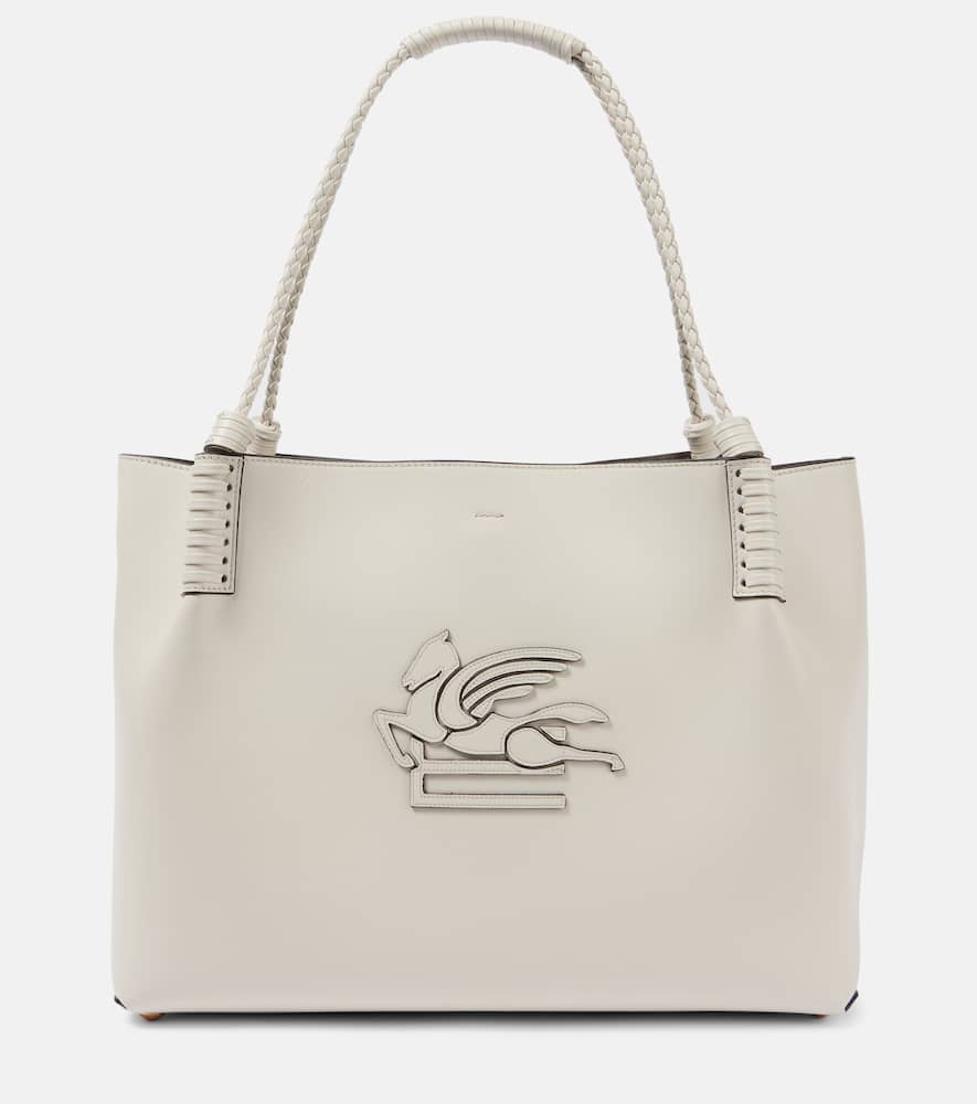 Material: leather. Lining: suede. Made in Italy. Designer color name: Bianco Latter. Leather shoulder strap. Detachable pouch. Closure: lobster-clasp fastening. Color of fastening: gold. Protective feet. Includes: dust bag. Shop the latest Etro Tote Bags for women now.