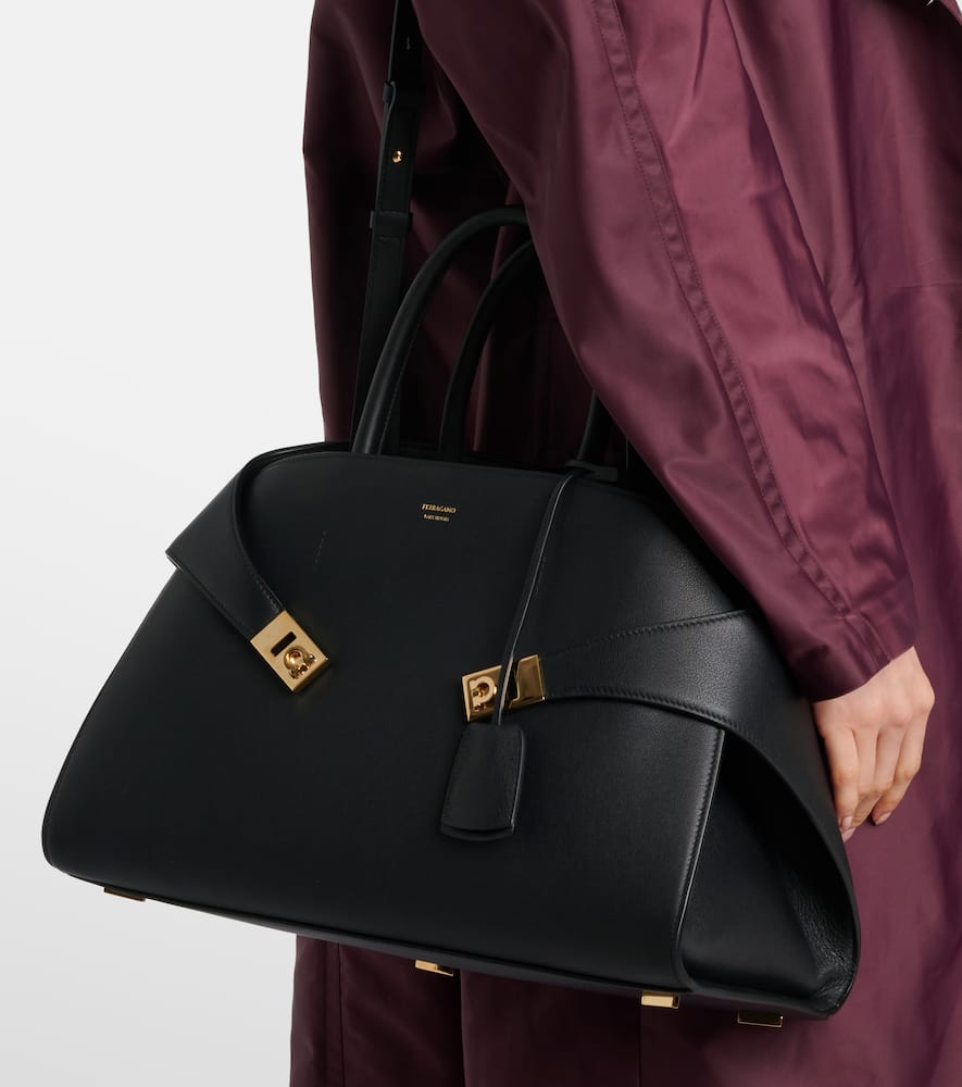 Material: calf leather. Lining: leather. Made in Italy. Designer color name: Nero. Internal details: internal zipped pocket. Closure: toggle fastening. Top handles, Detachable, adjustable shoulder strap. Protective feet. Includes: dust bag. Hardware color: gold. Shop the latest Ferragamo Top-Handle Bags for women now.