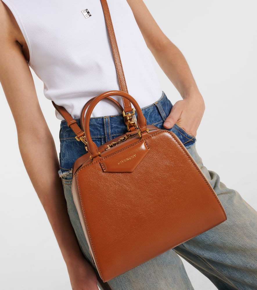 Material: leather. Lining: fabric. Made in Italy. Designer color name: Soft Tan. Closure: two-way zipped top. Top handles, Detachable, adjustable shoulder strap. Internal details: internal slot pocket. Shop the latest Givenchy Top-Handle Bags for women now.