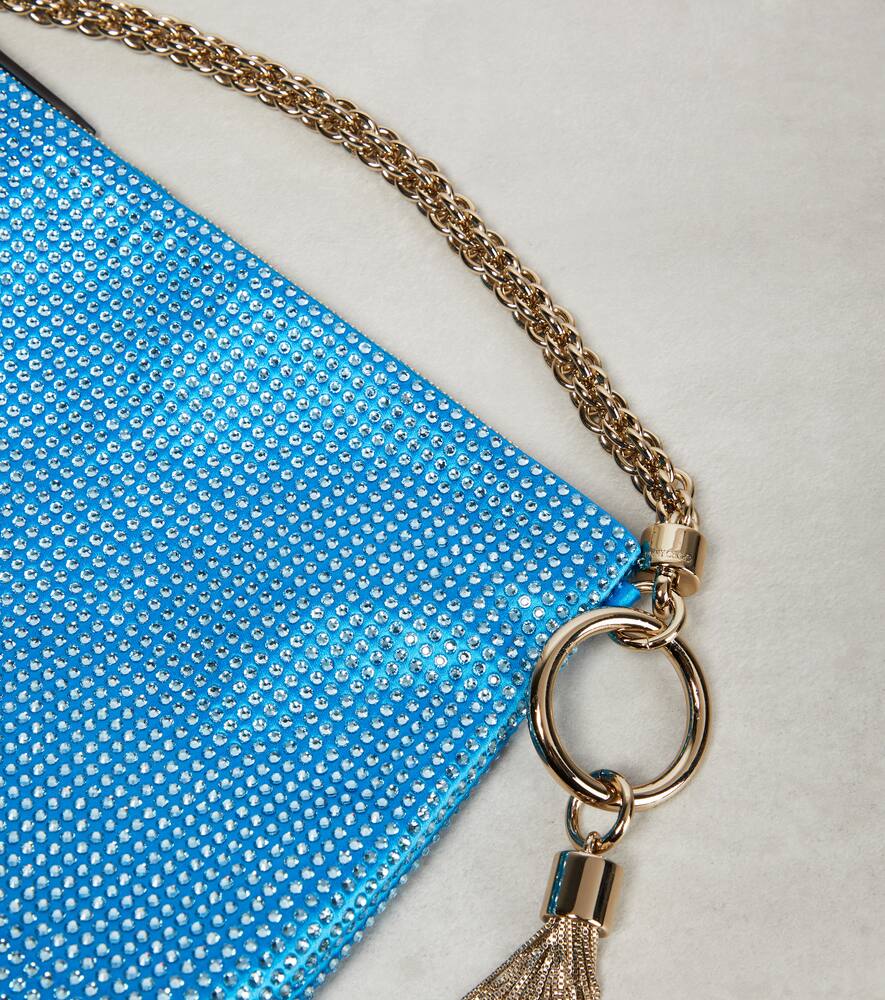 Color of fastening: gold. Comes with dust bag. Designer color name: Aqua Blue. Made in Italy. Internal details: satin lining. Closure: zipped top. Material: fabric. Color of chain strap: gold. Comes with a box. Chain shoulder strap. Shop the latest Jimmy Choo Top-Handle Bags for women now.