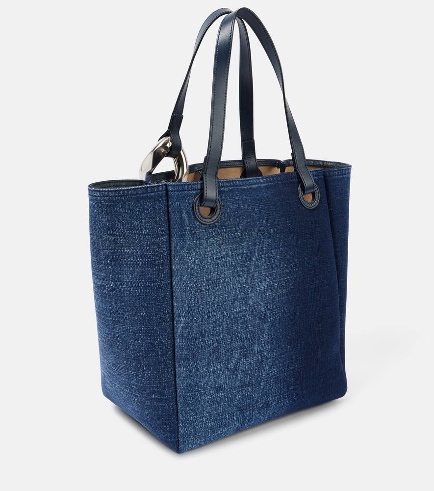 Material: fabric. Lining: suede. Made in Italy. Designer color name: Blue. Shoulder straps. Closure: snap-clasp fastening. Includes: dust bag. Trim: leather. Internal details: internal slot pocket. Hardware color: silver. Shop the latest JW Anderson Tote Bags for women now.