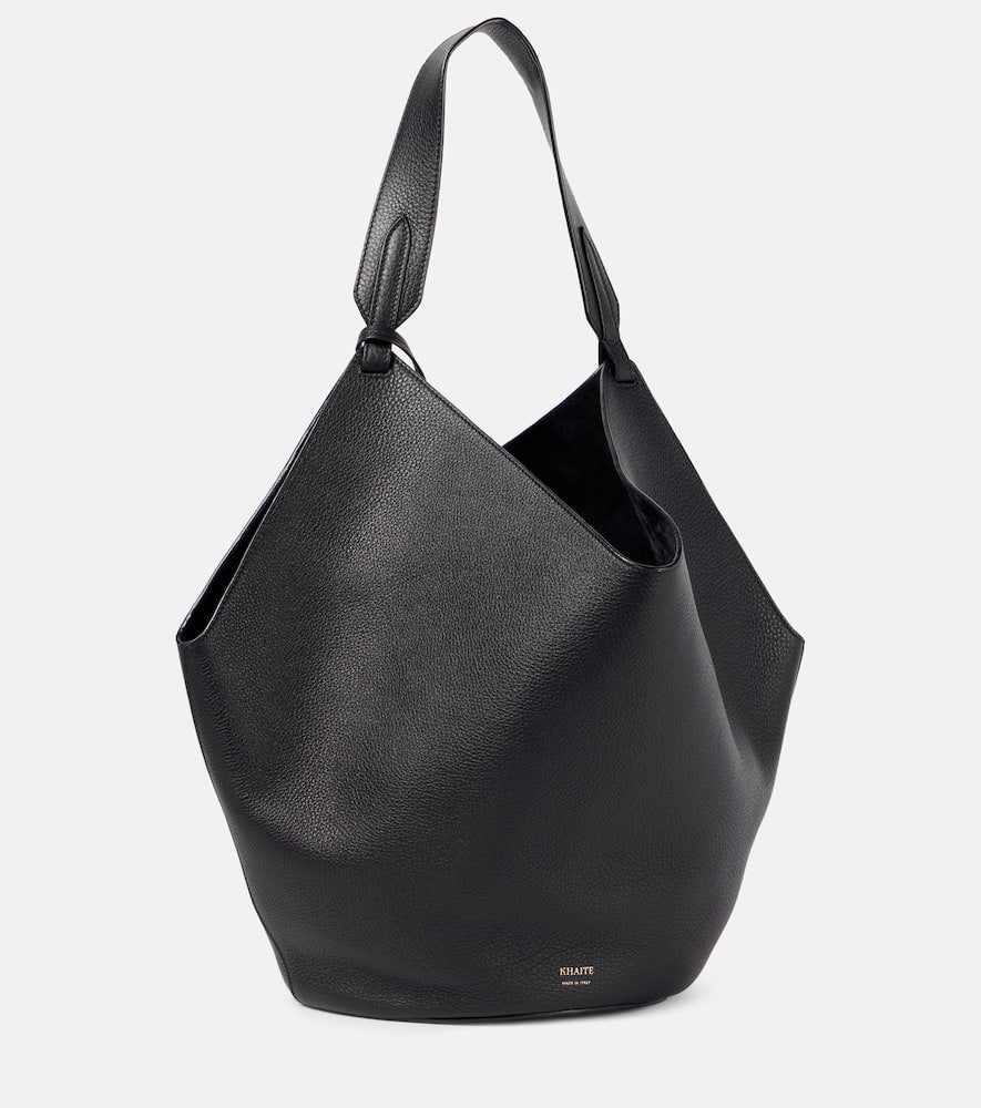Material: calf leather. Lining: suede. Made in Italy. Designer color name: Black. Closure: open top. Top handle. Detachable zipped pouch. Includes: dust bag. Shop the latest Khaite Tote Bags for women now.