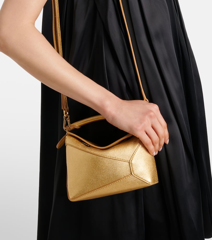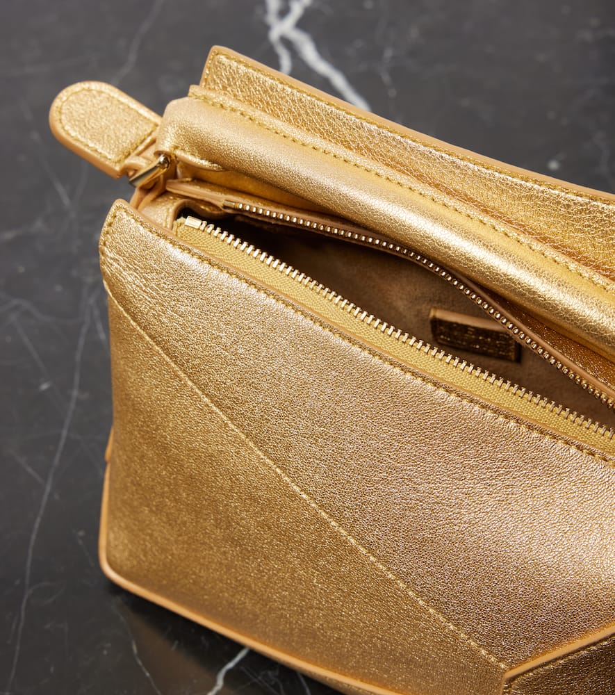 Material: leather. Lining: leather. Made in Spain. Designer color name: Gold. Closure: zipped top. Detachable, adjustable shoulder strap, Top handle. Hardware color: gold. Includes: dust bag. Shop the latest Loewe Top-Handle Bags for women now.