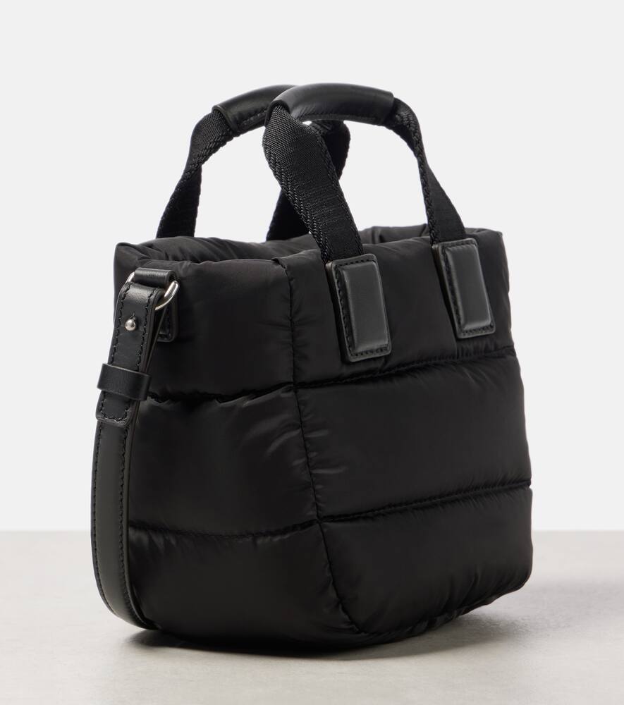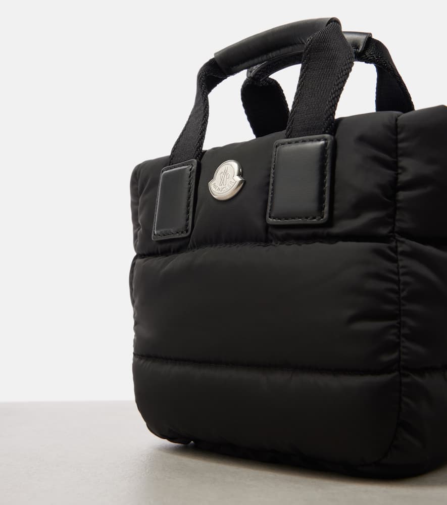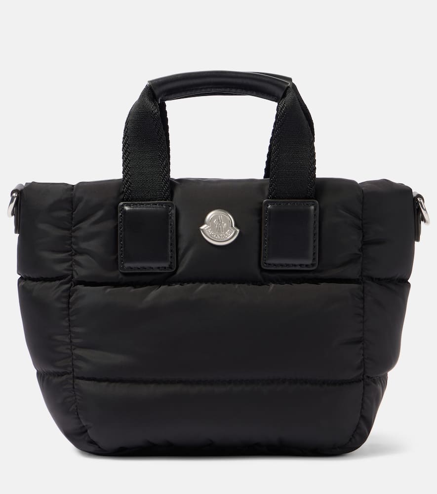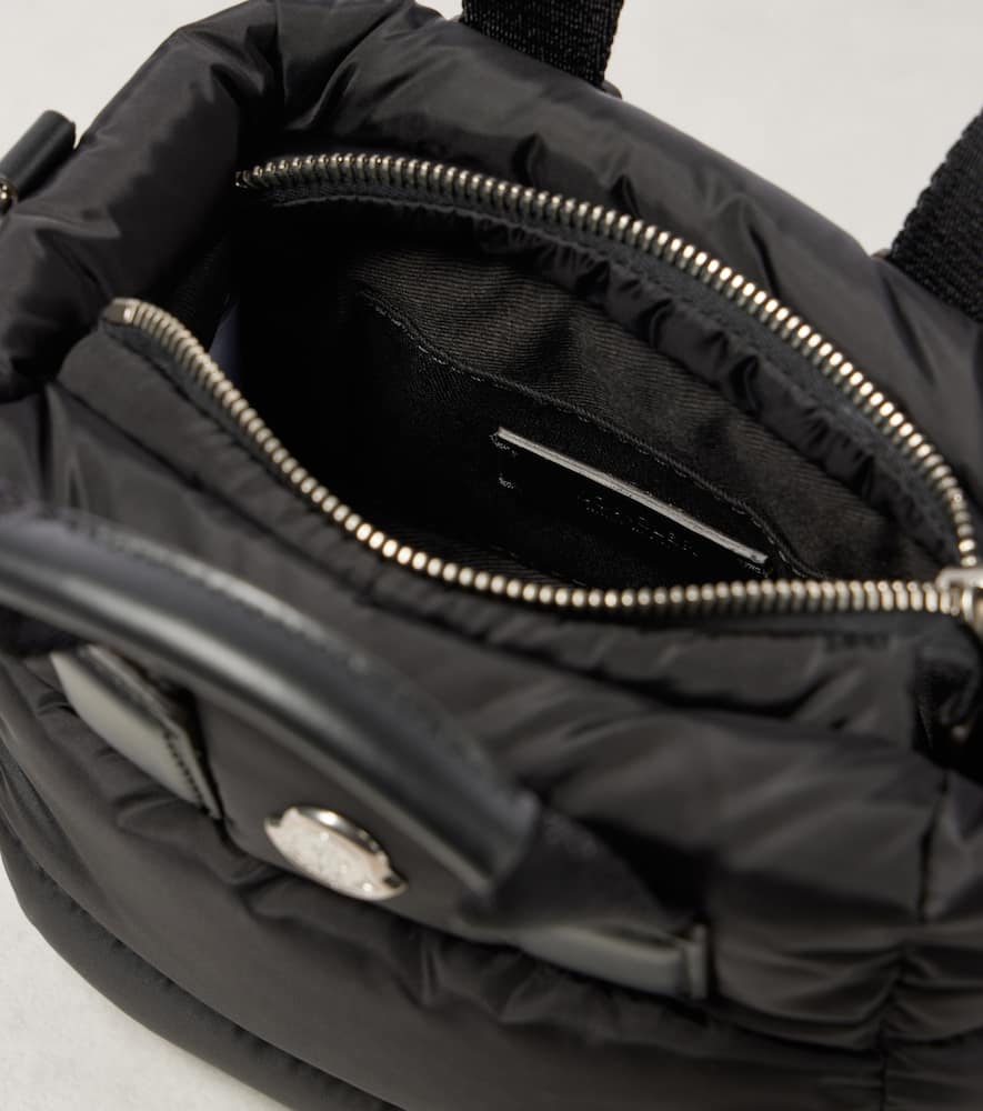 Material: polyamide. Lining: fabric. Made in Italy. Designer color name: Black. Includes: dust bag. Top handles, Detachable, adjustable shoulder strap. Hardware color: silver. Closure: zipped top. Contains non-textile parts of animal origin. Filling: 90% down, 10% feathers. Shop the latest Moncler Top-Handle Bags for women now.