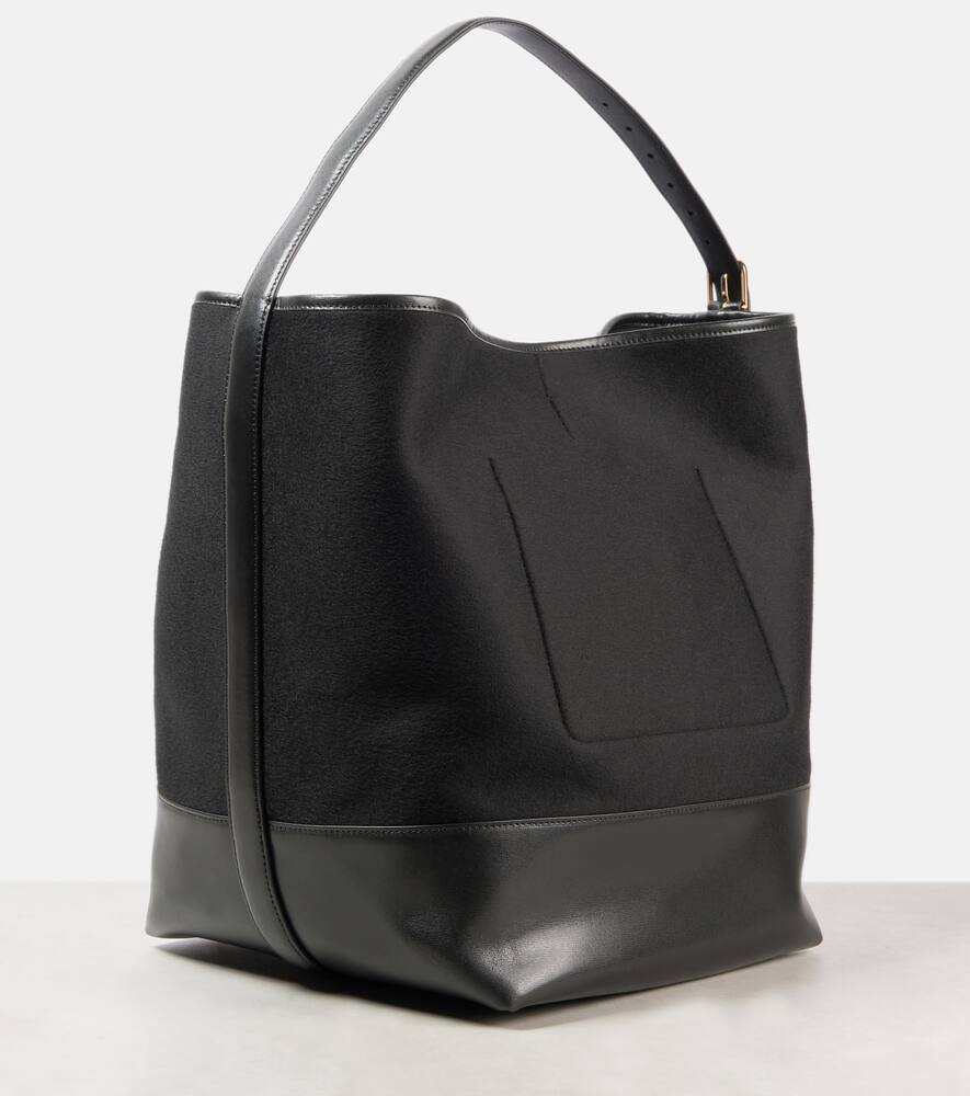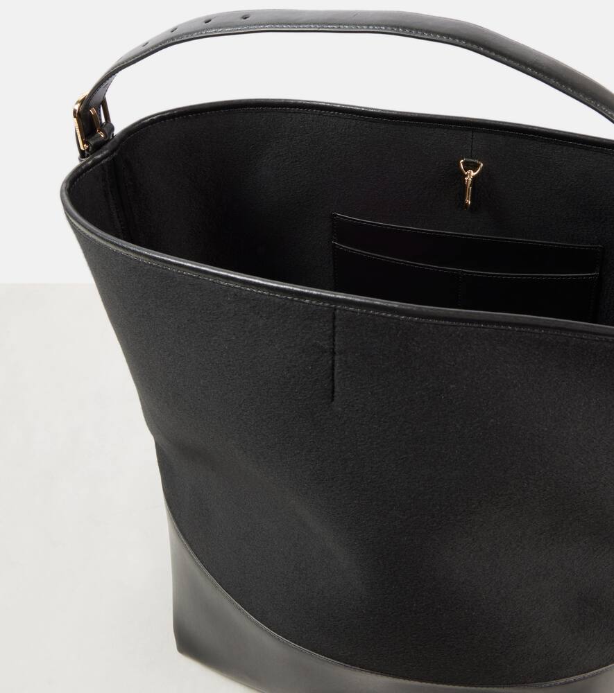 Material: wool. Lining: fabric. Made in Italy. Designer color name: Black 001. Trim: leather. Includes: dust bag. Adjustable shoulder strap. Closure: hook fastening. Hardware color: gold. Internal details: internal slot pockets. Shop the latest Toteme Bucket Bags for women now.