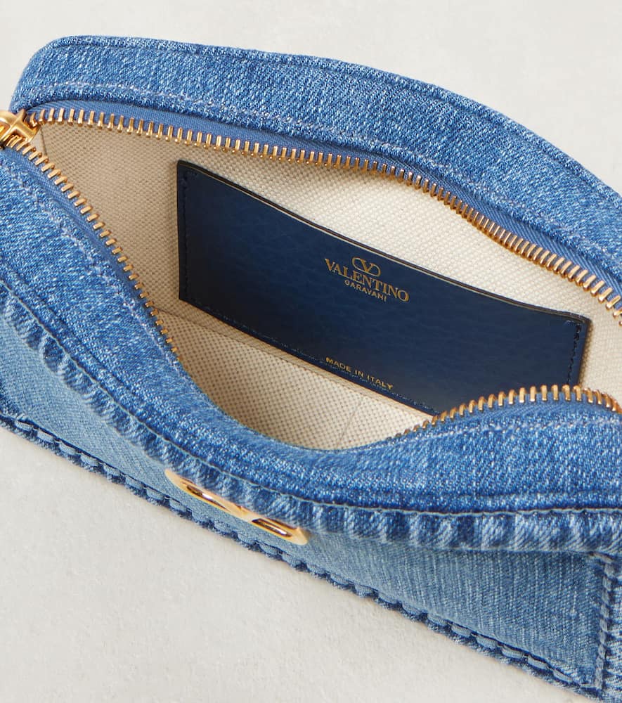 Material: fabric. Lining: fabric. Made in Italy. Designer color name: Denim/ Worker. Closure: zipped top. Detachable, adjustable shoulder strap. Hardware color: gold. Color of fastening: gold. Trim: leather. Includes: dust bag, box. Shop the latest Valentino Garavani Crossbody Bags for women now.