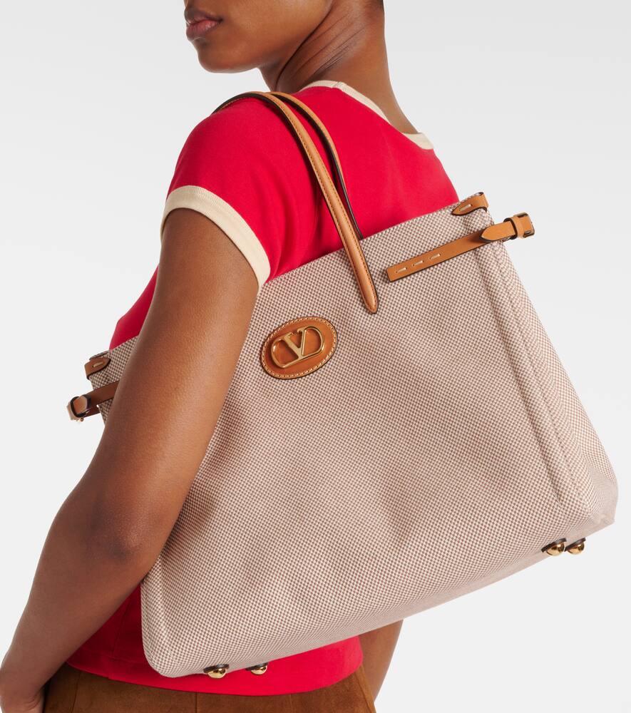 Material: fabric. Lining: fabric. Made in Italy. Designer color name: Naturale-Tobacco / Natural Camel. Trim: leather. Top handles, Detachable, adjustable shoulder strap. Closure: magnetic fastening. Includes: dust bag. Protective feet. Buckle-fastening sides for adjustable width. Internal details: internal zipped pocket. Shop the latest Valentino Garavani Tote Bags for women now.