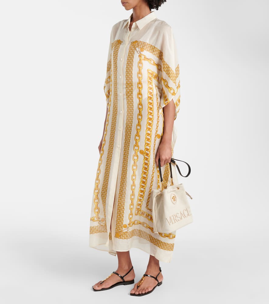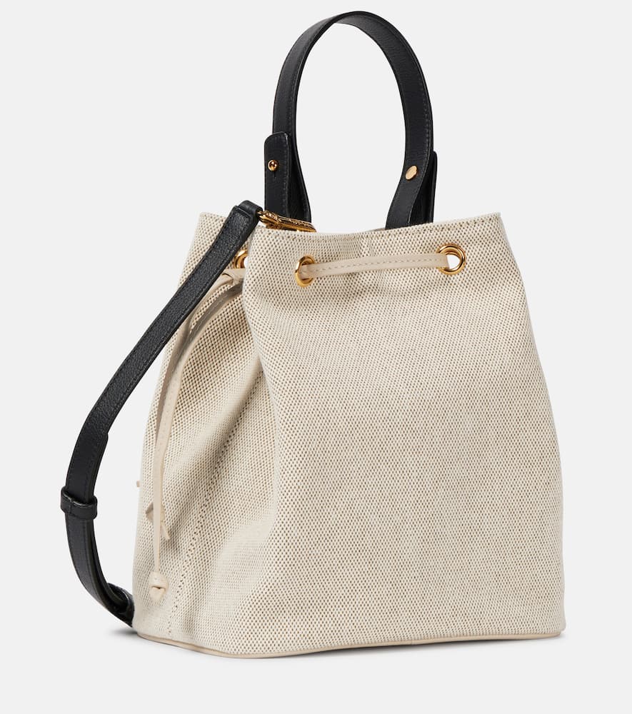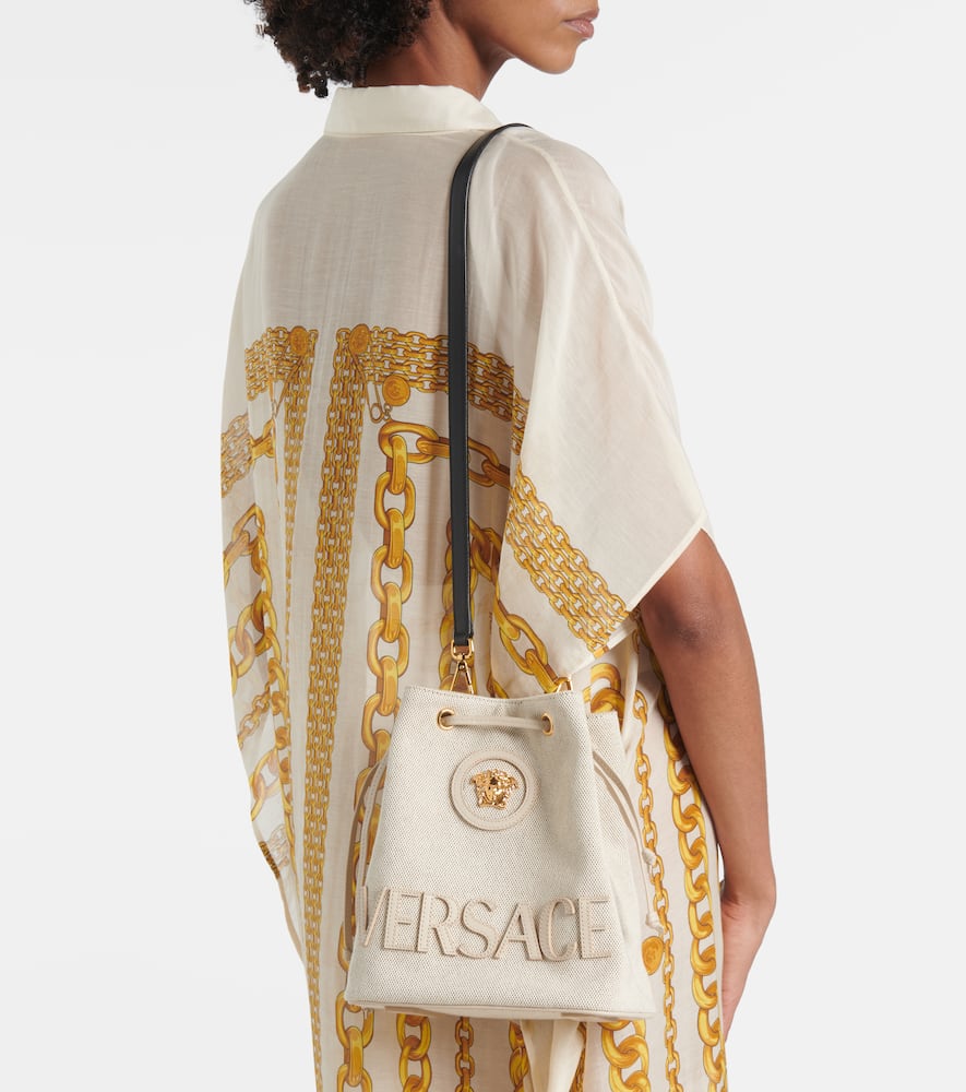 Material: cotton. Lining: cotton. Made in Italy. Designer color name: Rope+Ice+Black+Versace+Gold. Trim: calf leather. Closure: drawstring top. Top handle, Detachable, adjustable shoulder strap. Hardware color: gold. Includes: dust bag. Shop the latest Versace Bucket Bags for women now.