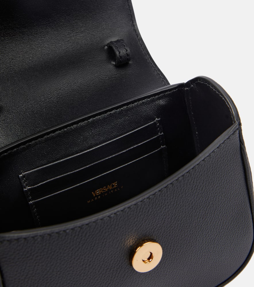 Top handle, Adjustable shoulder strap. Color of fastening: gold. Designer color name: Black-Versace Gold. Comes with dust bag. Made in Italy. Internal details: leather lining, Card slots. Closure: magnetic-tab fastening. Material: calf leather. Shop the latest Versace Top-Handle Bags for women now.