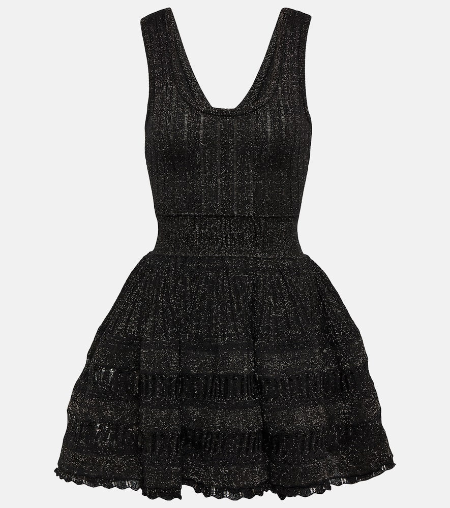 Material: 8% metallic fibres, 61% wool, 31% viscose. Material II: 8% metallic fibres, 2% elastane, 55% wool, 31% viscose, 4% polyamide. Material III: 3% elastane, 26% viscose, 6% metallic fibres, 7% polyamide, 68% wool. Designer color name: Noir/Or. Material IV: 64% polyamide, 4% elastane, 1% viscose, 31% wool. Made in Italy. Elasticated waistband. Care instructions: dry clean. Shop the latest Alaia Mini Dresses for women.
