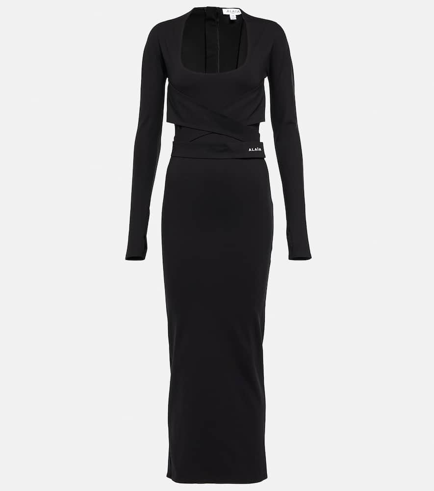 Made in Italy. Self-tie back. Closure: invisible zipper. Designer color name: Noir Alaia. Material: 74% polyamide, 26% elastane. Care instructions: hand wash. Shop the latest Alaia Midi Dresses for women.