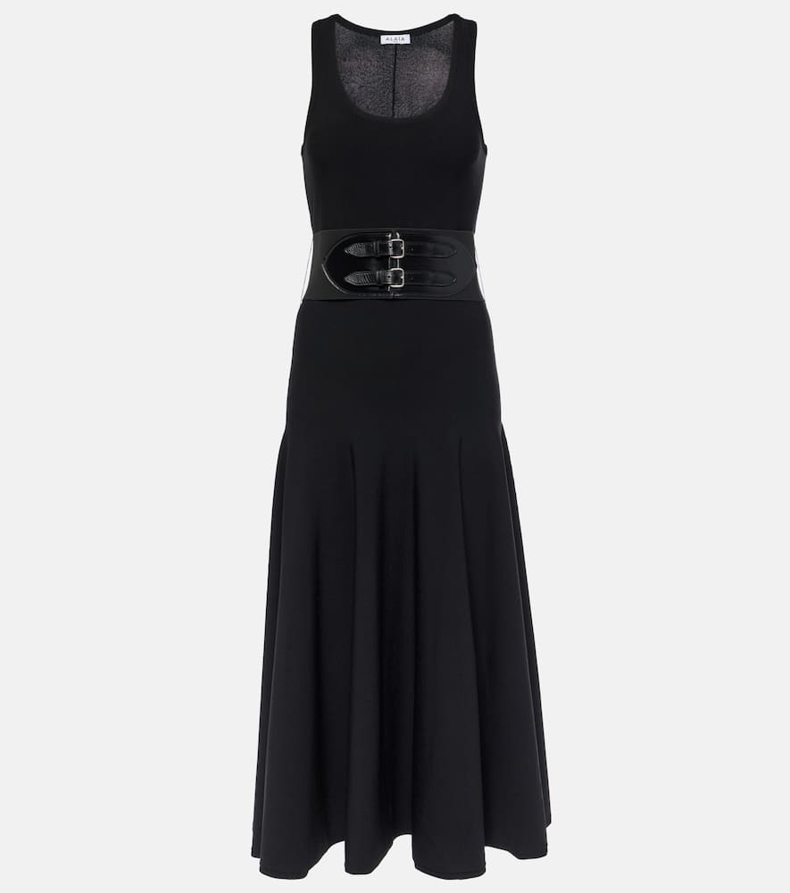 Material: 75% viscose, 25% polyester. Care instructions: specialist clean. Made in Italy. Designer color name: Noir Alaia. Material II: 72% polyamide, 28% elastane. Trim: 100% leather. Contains non-textile parts of animal origin. Shop the latest Alaia Midi Dresses for women.