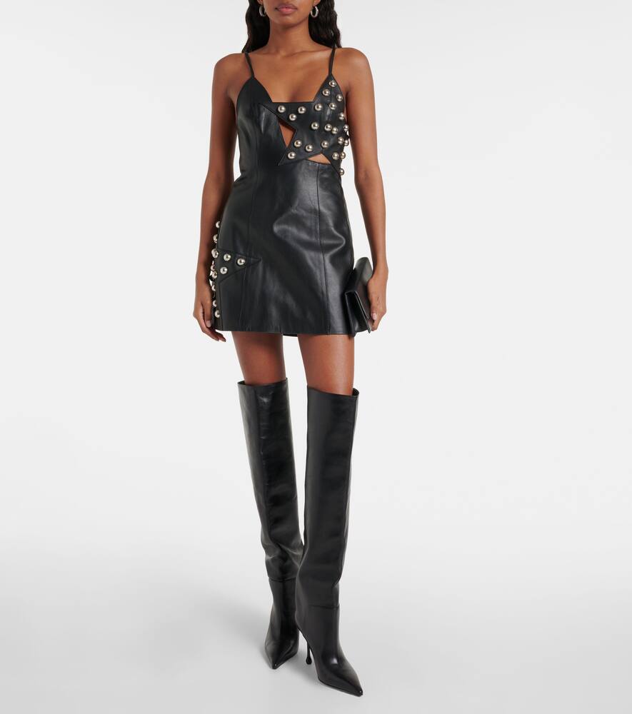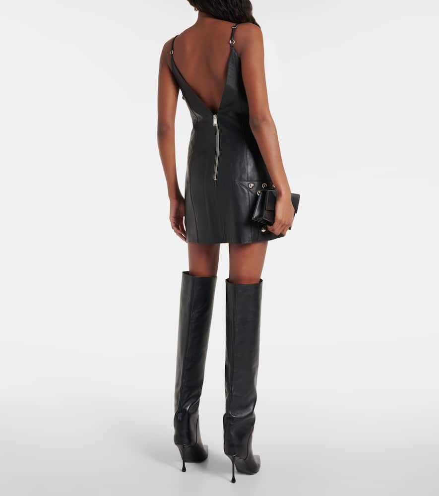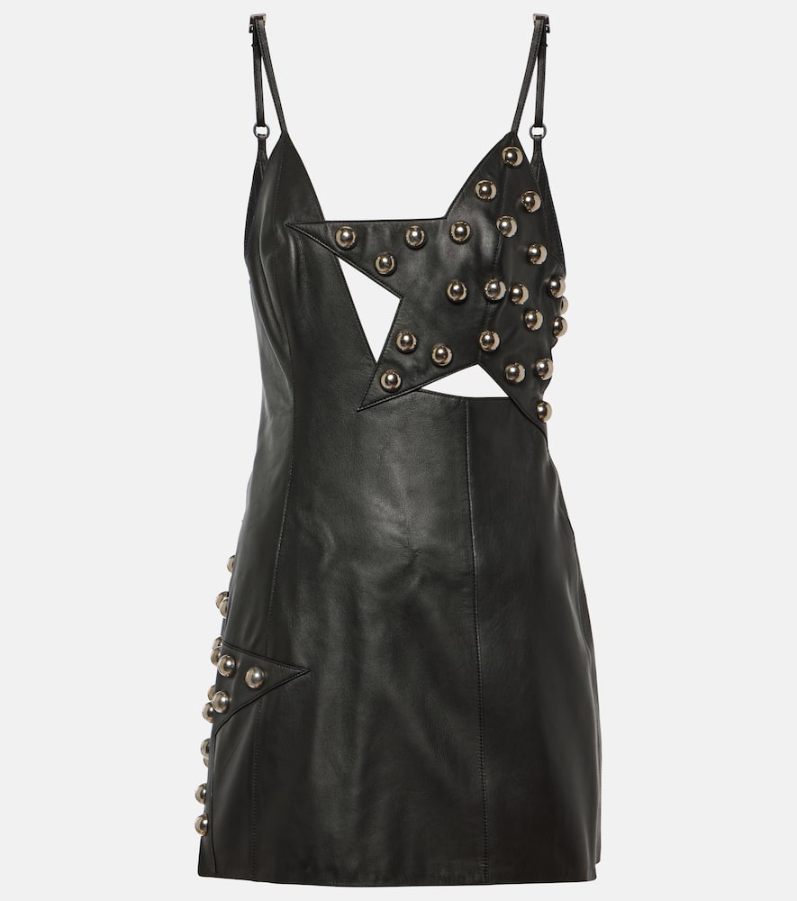 Material: 100% leather. Care instructions: specialist clean. Made in India. Designer color name: Black. Adjustable shoulder straps. Closure: zipped back. Shop the latest Area Mini Dresses for women.