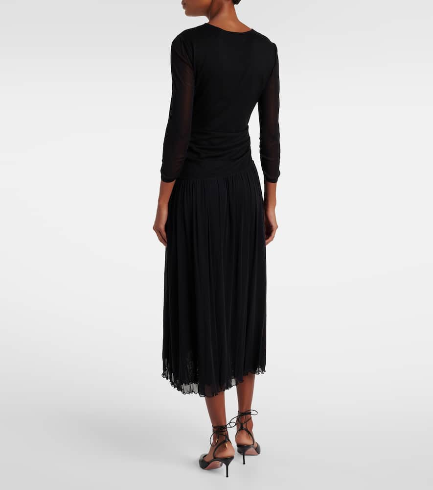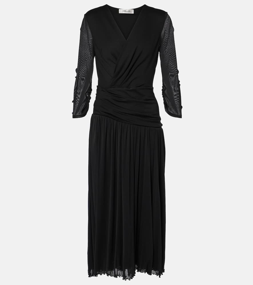 Material: 87% viscose, 10% polyamide, 3% elastane. Care instructions: dry clean. Made in China. Designer color name: Black 87%visocse, 10%nylon, 3%spandex, trim:100%nylon. Lining: 100% polyamide. Closure: zipped side. Shop the latest Diane von Furstenberg Midi Dresses for women.