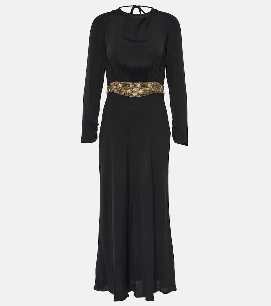Material: 100% viscose. Care instructions: dry clean. Made in India. Designer color name: Antique Embellishment Black. Closure: zipped side. Self-tie back. Shop the latest Rixo Midi Dresses for women.