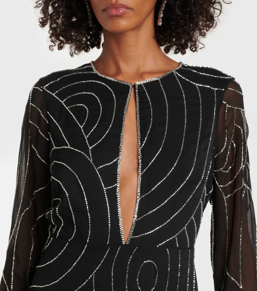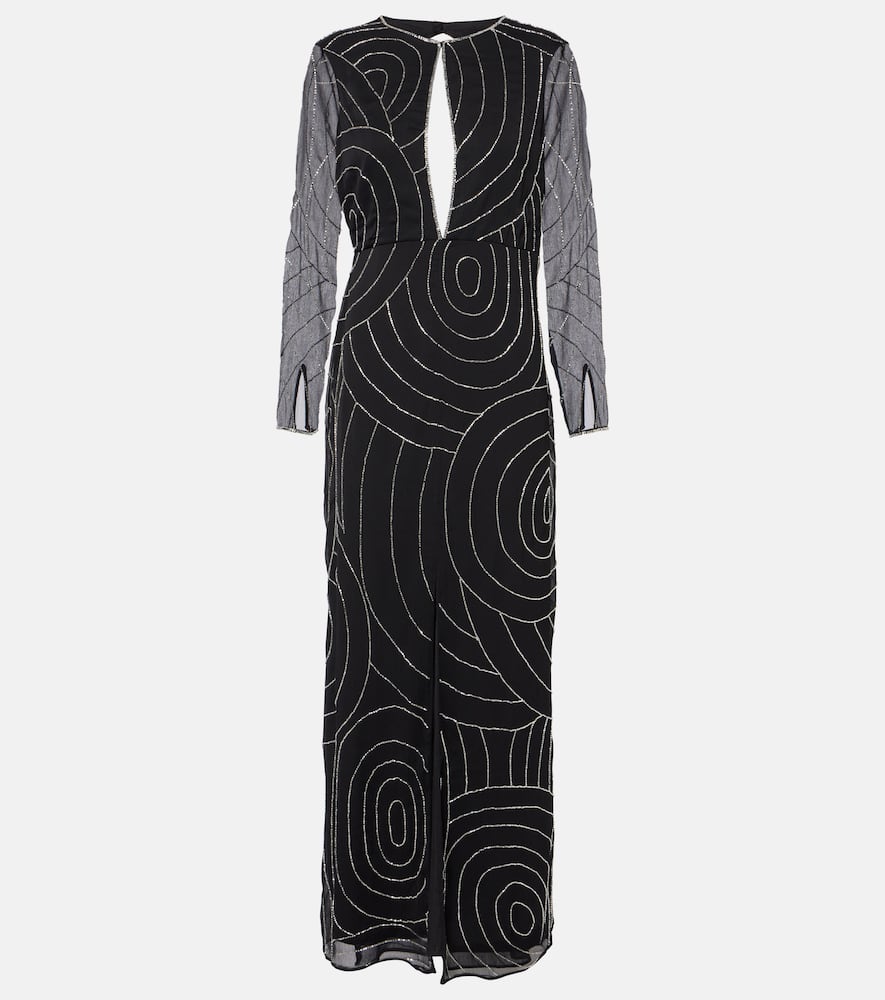 Material: 100% polyester. Care instructions: dry clean. Made in India. Designer color name: Whirlpool Black. Closure: hook-fastening back. Shop the latest Rixo Maxi Dresses for women.