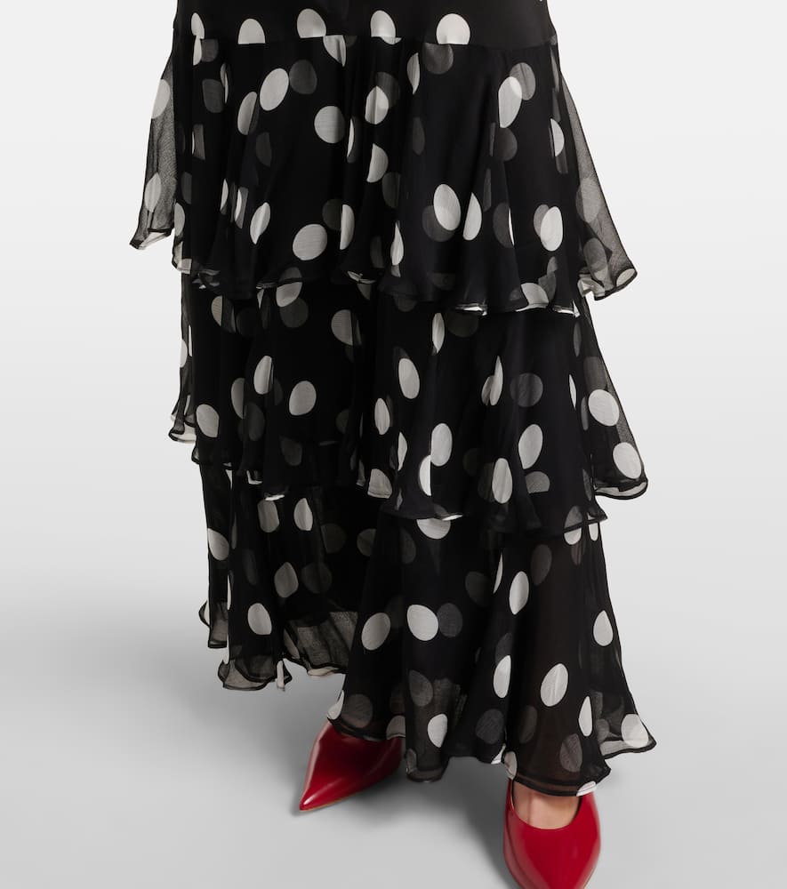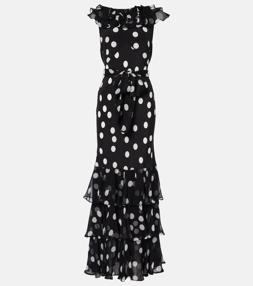 Material: 100% silk. Care instructions: dry clean. Made in China. Designer color name: Mono Polka Dot Black. Material II: 100% viscose. Lining: 100% polyester. Closure: zipped back. Detachable belt. Belt loops. Shop the latest Rixo Maxi Dresses for women.