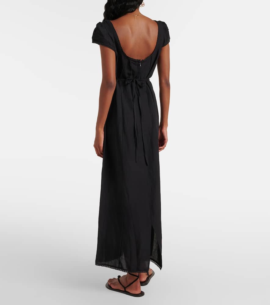 Material: 65% viscose, 35% linen. Care instructions: dry clean. Made in India. Designer color name: Bouquet Emb Black. Closure: self-ties. Shop the latest Rixo Midi Dresses for women.