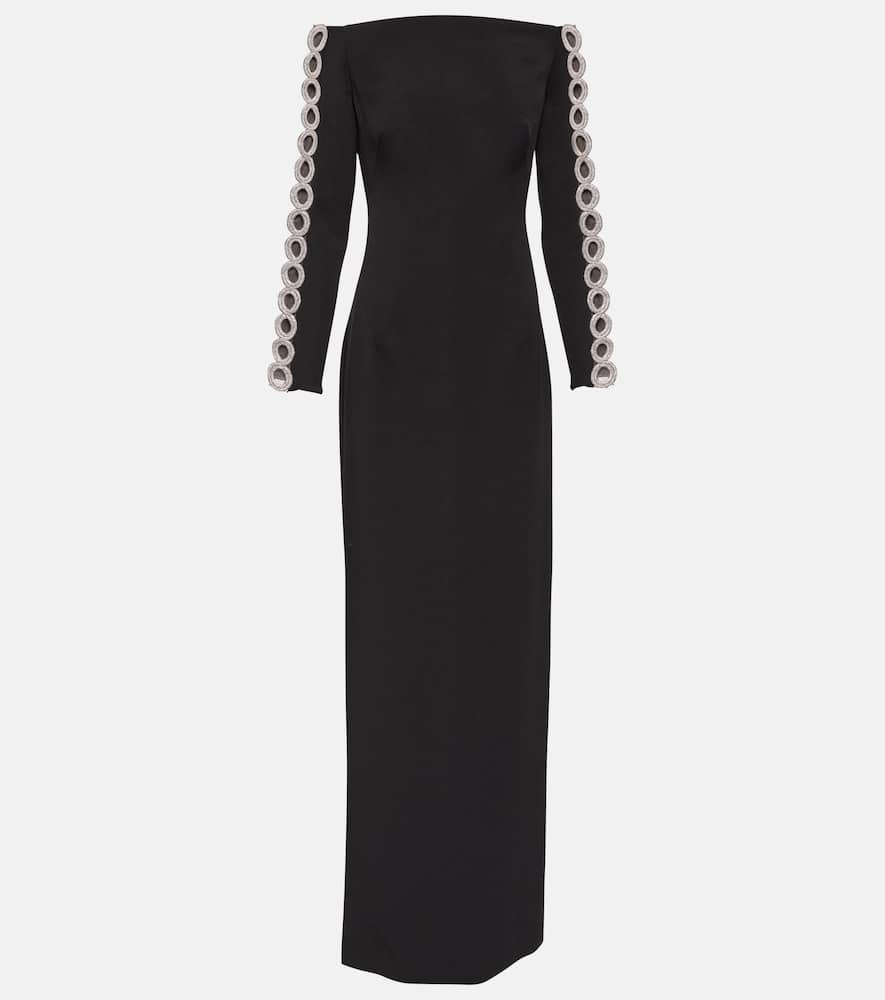 Material: 92% polyester, 8% elastane. Care instructions: dry clean. Made in Turkey. Designer color name: Black White With Crystal. Embroidery: 70% acrylic, 30% resin. Side slits. Closure: zipper, hook fastening. Shop the latest Safiyaa Maxi Dresses for women.