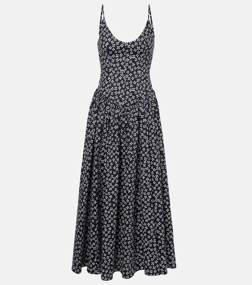 Material: 98% cotton, 2% elastane. Care instructions: machine wash cold. Made in China. Designer color name: Black Woodblock Floral. Adjustable shoulder straps. Closure: invisible zipper. Shop the latest Staud Maxi Dresses for women.