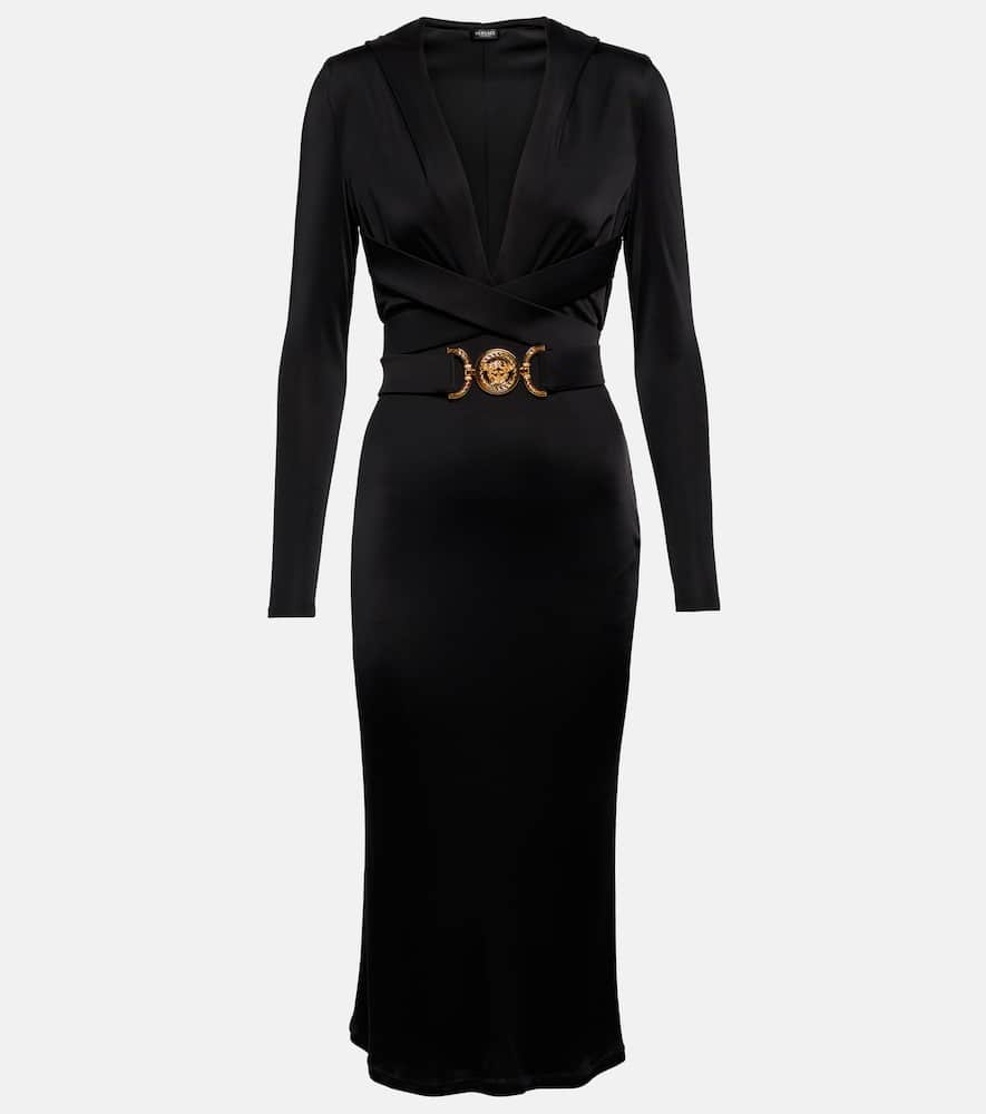 Made in Italy. Closure: zipped side, invisible zipper. Material: 100% viscose. Designer color name: Black. Lining: 100% viscose, partially lined. Hood. Care instructions: dry clean. Shop the latest Versace Midi Dresses for women.