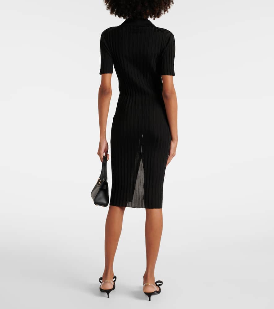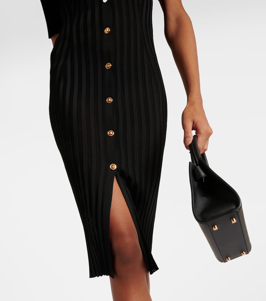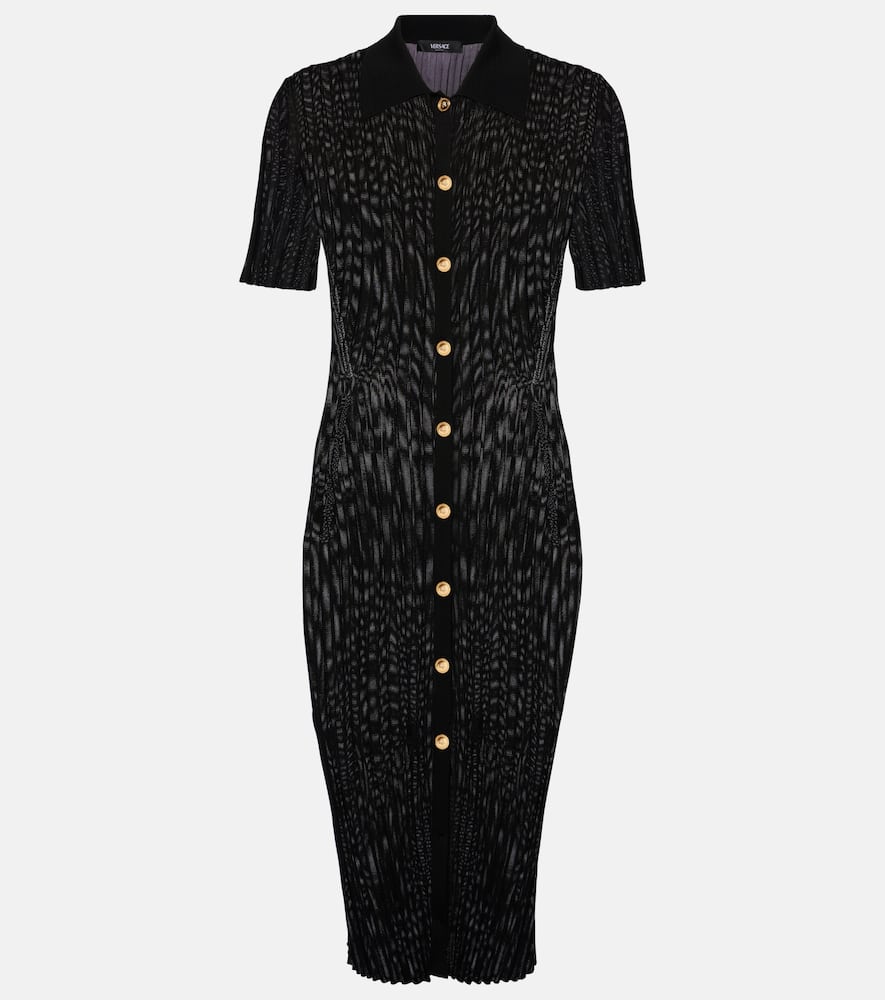 Material: 100% viscose. Care instructions: dry clean. Made in Italy. Designer color name: Black. Trim: 71% viscose, 23% polyamide, 6% polyurethane. Closure: buttoned front. Shop the latest Versace Midi Dresses for women.
