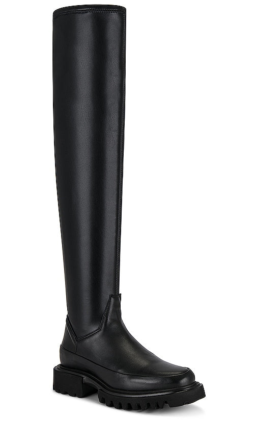 ALLSAINTS Leona Boot in Black. - size 37 (also in 39, 40, 41) ALLSAINTS Leona Boot in Black. - size 37 (also in 39, 40, 41) Leather upper with manmade sole. Made in Portugal. Partial side zipper closure. Leather footbed with textile lining. Almond toe. Approx 32mm/ 1.25 inch heel Approx 13mm/ 0.75 inch platform Approx 558mm/ 22 inch shaft Shaft measures approx 12.56 in circumference. ALLR-WZ116. WF587Z. Founded in East London in 1994, AllSaints breaks through the noise to offer something different. Cult leather jackets and signature biker boots - it's what they do. Prints you weren't expecting, and accessories you'll keep coming back for. It's about innovation, about turning your back on the trends and making your own rules, a uniform without uniformity. AllSaints is an attitude, wear it your way. Shop the latest in fashion from ALLSAINTS