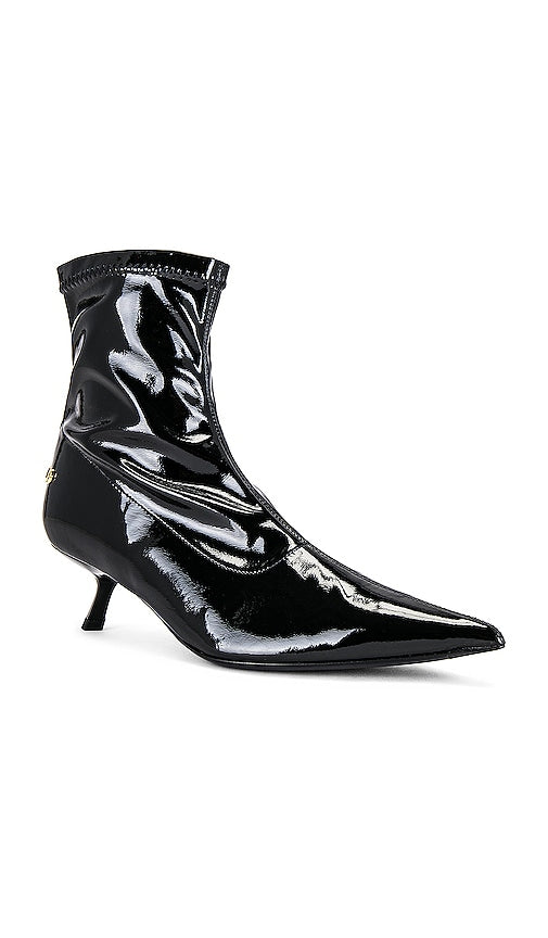 ANINE BING Hilda Boots in Black. - size 38 (also in 39, 40) ANINE BING Hilda Boots in Black. - size 38 (also in 39, 40) Faux patent leather upper with leather sole. Made in China. Pull-on styling. Leather footbed and lining. Pointed toe with slanted kitten heel. Approx 50mm/ 2 inch heel Approx 150mm/ 6 inch shaft. ANIN-WZ112. A-14-1089-050. Inspired by Scandinavian simplicity and vintage Americana, Los Angeles based fashion house Anine Bing has created a global brand for the modern woman seeking a timeless yet rebellious approach to style. From luxurious staples to wardrobe basics, Anine Bing provides the highest quality fabrications and materials in each collection that effortlessly fuse together edgy feminine designs. Shop the latest in fashion from ANINE BING