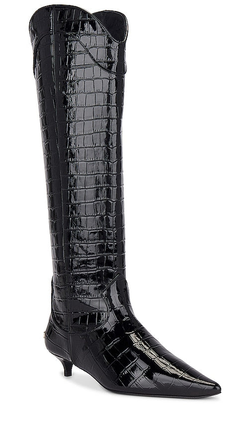 ANINE BING Tall Rae Boots in Black. - size 36 (also in 37, 38, 40) ANINE BING Tall Rae Boots in Black. - size 36 (also in 37, 38, 40) Croc embossed patent leather upper with leather sole. Made in Turkey. Pull-on styling. Leather footbed and lining. Pointed toe with kitten heel. Approx 45mm/ 1.75 inch heel Approx 393mm/ 15.5 inch shaft Shaft measures approx 12.56 in circumference. ANIN-WZ110. A-14-5144-010. Inspired by Scandinavian simplicity and vintage Americana, Los Angeles based fashion house Anine Bing has created a global brand for the modern woman seeking a timeless yet rebellious approach to style. From luxurious staples to wardrobe basics, Anine Bing provides the highest quality fabrications and materials in each collection that effortlessly fuse together edgy feminine designs. Shop the latest in fashion from ANINE BING