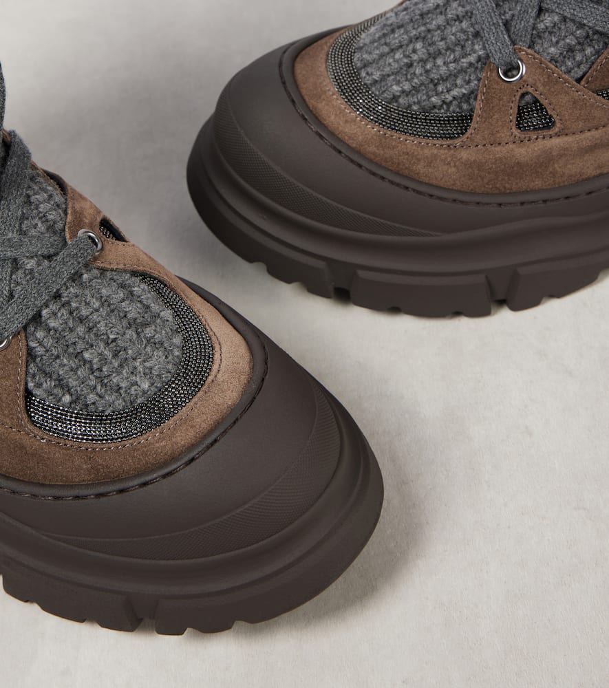 Upper: leather, rubber. Lining: leather. Sole: leather insole, rubber sole. Toe shape: round toe. Made in Italy. Includes: shoe box, dust bags. Designer color name: Torba. Closure: lace-up. Trim: fabric. Shop the latest Brunello Cucinelli Ankle Boots for women now.