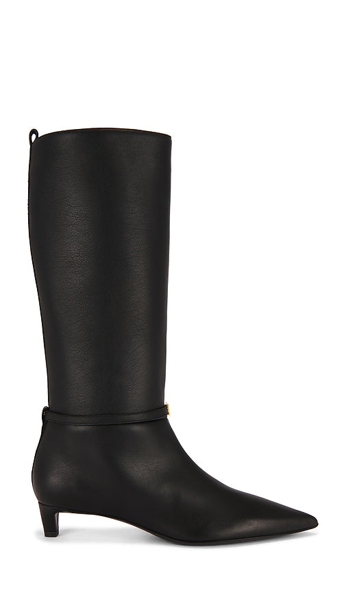 Leather upper with manmade sole. Pull-on styling. Leather footbed and lining. Strap at shaft with gold-tone metal logo hardware. Pointed toe with kitten heel. Approx 32mm/ 1.25 inch heel Approx 343mm/ 13.5 inch shaft Opening measures approx 12.56 in circumference. BYMA-WZ8. 103641. As the first Danish designer to launch a haute couture line, Malene Birger is at the top of her game with representation in over 15 countries world wide. With a classic elegance expressed with edgy, sexy sophistication, her line echoes style icons from the past transformed to present day extravagance. Color: Black. Shop Black Black Boots for women and the latest By Malene Birger shoes now.
