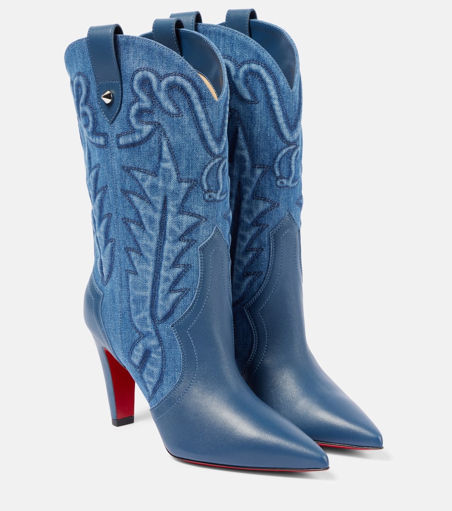 Upper: fabric. Lining: leather. Sole: leather insole and sole. Toe shape: pointed toe. Made in Italy. Includes: shoe box, dust bag. Designer color name: Denim/Brut. Trim: leather. Hardware color: silver. Shop the latest Christian Louboutin Mid-Heel Boots for women now.