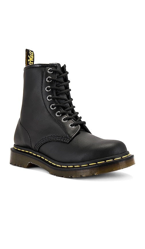 Dr. Martens 1460 8-Eye Boot in Black. Leather upper with rubber sole. Made in Vietnam. Lace-up front. Built on the iconic Dr. Martens air-cushioned sole. Grooved sides with yellow welt stitching. Approx 32mm/ 1.25 inch heel Approx 10mm/ 0.5 inch platform Approx 150mm/ 6 inch shaft. DMAR-WZ2. 11821002. When the Dr. Martens boot first catapulted from a working-class essential to a counter-cultural icon back in the 1960s, the world was pre-internet, pre-MTV, pre-CD, pre-mp3s, pre-mobile phones. Hey, they'd only just invented the teenager. In the years before the boot's birthday, 1st April, 1960, kids just looked like tribute acts to their parents, younger but the same. Rebellion was only just on the agenda for some - for most kids of the day, starved of music, fashion, art and choice, it was not even an option. Shop the latest in fashion from Dr. Martens