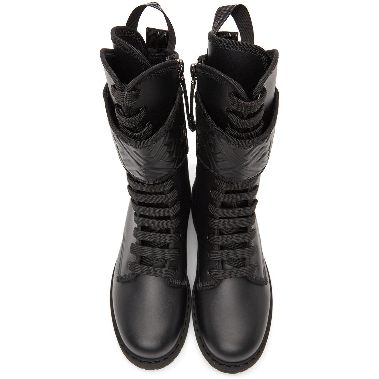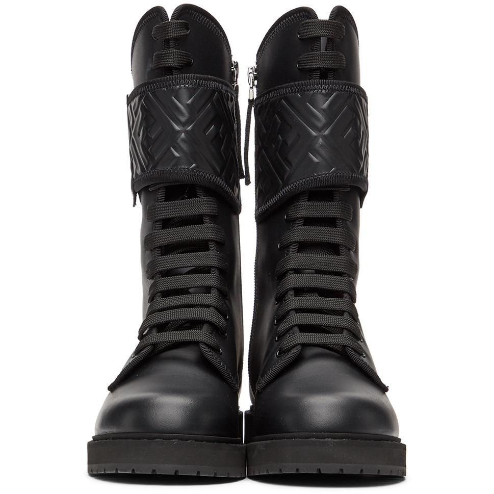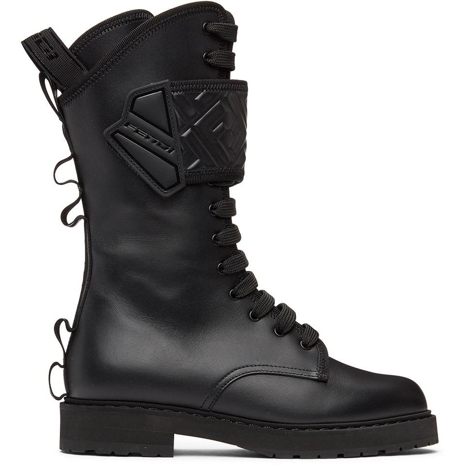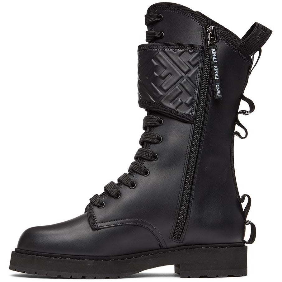 Calf-high buffed calfskin boots in black. Round toe. Tonal lace-up closure. Velcro strap with embossed logo pattern at collar. Tonal logo printed webbing pull-loop at heel collar. Tonal logo printed webbing daisy-chain trim at collar. Zip closure at inner side. Tonal stretch nylon lining. Tonal foam rubber midsole. Tonal treaded rubber outsole. Black and gunmetal-tone hardware. Supplier color: Black Upper: calfskin. Sole: rubber. Brand: Fendi