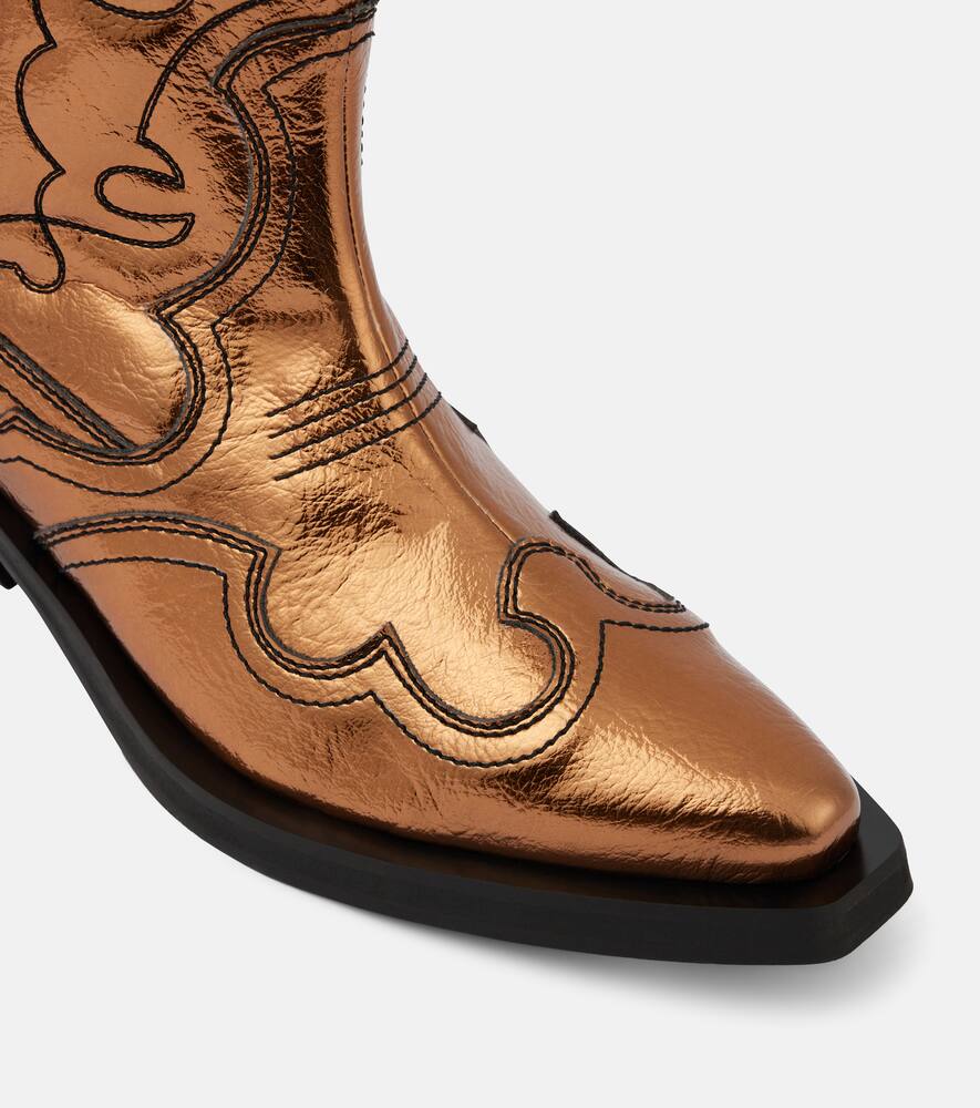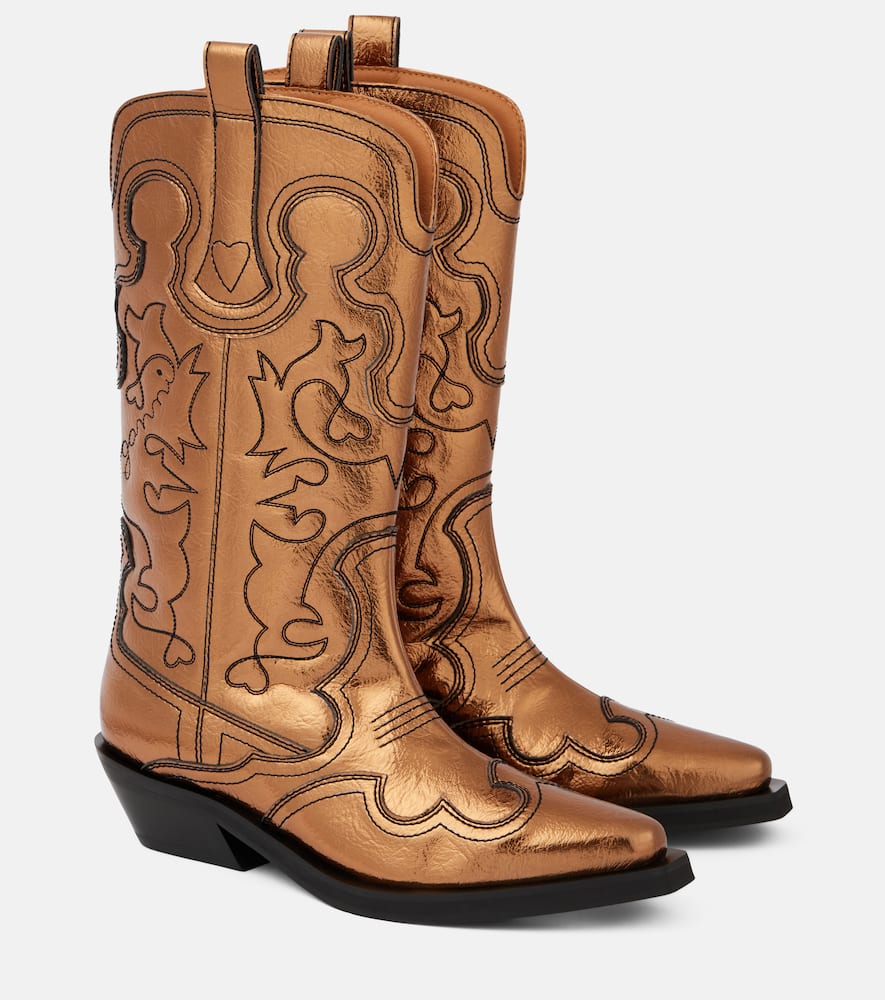 Upper: faux leather. Lining: faux leather. Sole: faux leather insole, rubber sole. Toe shape: pointed toe. Made in Portugal. Includes: shoe box, dust bag. Designer color name: Bronze. Shop the latest Ganni Mid-Heel Boots for women now.
