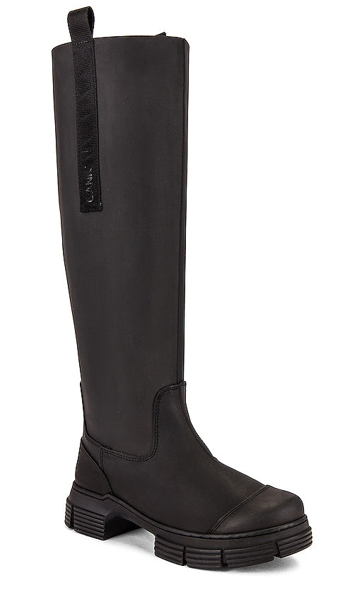 Ganni Country Boot in Black. - size 35 (also in 36, 37) Ganni Country Boot in Black. - size 35 (also in 36, 37) Recycled rubber boots with lug sole. Made in Portugal. Side pull tabs with logo detail. Water-repellant design. Approx 40mm/ 1.5 inch heel Approx 25mm/ 1 inch platform Approx 419mm/ 16.5 inch shaft. GANR-WZ30. S2172. Founded in 2000, the Ganni brand aims to design effortless staples for a woman's wardrobe that she's tempted to reach for day in and day out. By doing this, they create quality fashion that can be worn in many different ways to suit any personal style. Shop the latest in fashion from Ganni