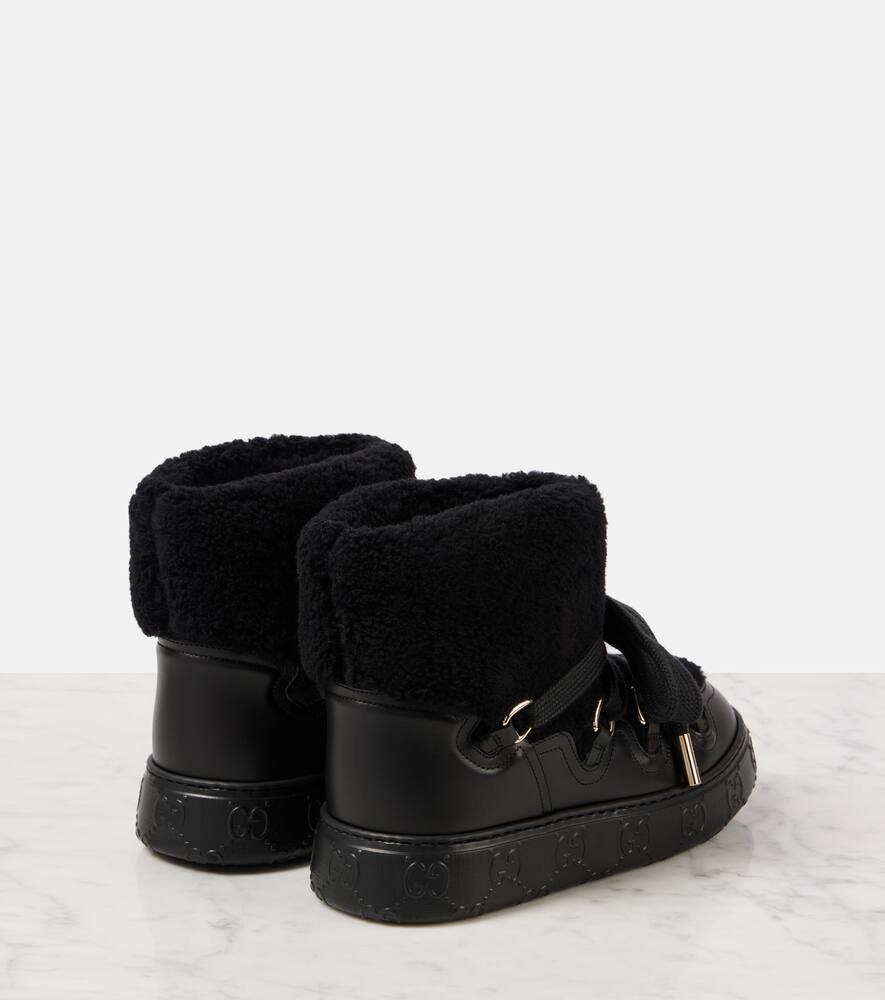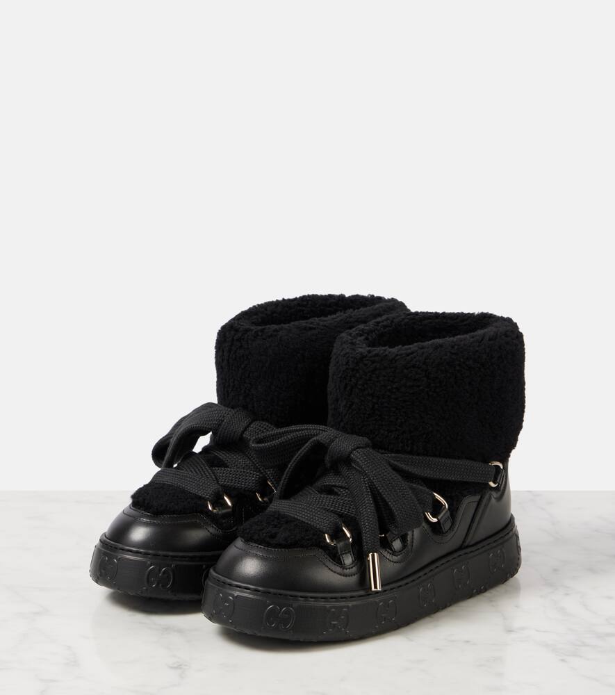 Upper: leather, wool. Lining: wool. Sole: fur insole, rubber sole. Toe shape: round toe. Made in Italy. Includes: shoe box. Designer color name: Black/ Black. Hardware color: gold. Closure: lace-up. Shop the latest Gucci Ankle Boots for women now.