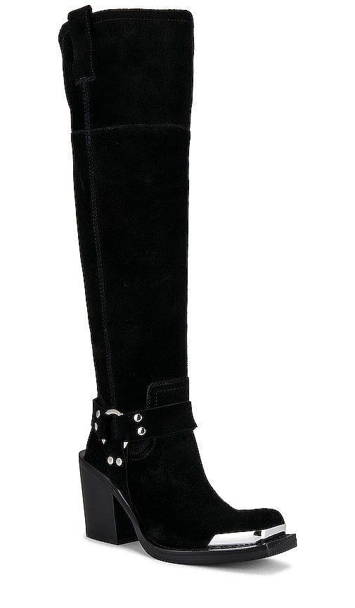 Jeffrey Campbell Mazatlan Boot in Black. - size 10 (also in 6, 6.5, 7, 7.5, 8, 8.5, 9, 9.5) Jeffrey Campbell Mazatlan Boot in Black. - size 10 (also in 6, 6.5, 7, 7.5, 8, 8.5, 9, 9.5) Suede upper with rubber sole. Made in China. Pull-on styling. Side pull-tabs. Silver-tone rings and hardware. Square toe with silver-tone metal plate and wooden block heel. Approx 90mm/ 3.5 inch heel Approx 470mm/ 18.5 inch shaft Shaft measures approx 15.7 in circumference. JCAM-WZ1679. MAZATLAN. Step into comfort and fashion this season with these new shoes from Jeffery Campbell. Made with premium leather and a German sole. These pretty babies will keep you coming back for more. Shop the latest in fashion from Jeffrey Campbell