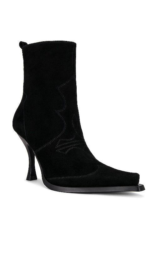 Jeffrey Campbell Rebels Boot in Black. - size 10 (also in 6, 6.5, 7.5, 8, 8.5, 9, 9.5) Jeffrey Campbell Rebels Boot in Black. - size 10 (also in 6, 6.5, 7.5, 8, 8.5, 9, 9.5) Suede upper with manmade sole. Made in China. Side zipper closure. Leather footbed and lining. Back pull-tab. Tonal Western inspired stitching. Pointed toe with wooden spool heel. Approx 95mm/ 3.75 inch heel Approx 150mm/ 6 inch shaft. JCAM-WZ1684. REBELS. Step into comfort and fashion this season with these new shoes from Jeffery Campbell. Made with premium leather and a German sole. These pretty babies will keep you coming back for more. Shop the latest in fashion from Jeffrey Campbell