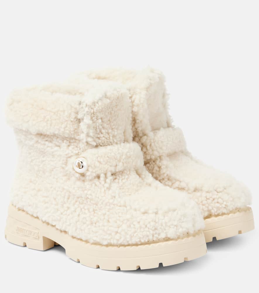 Upper: shearling. Lining: shearling. Sole: shearling insole, rubber sole. Toe shape: round toe. Made in Italy. Includes: shoe box, dust bags. Designer color name: Natural. Closure: faux-buckle fastening. Shop the latest Jimmy Choo Ankle Boots for women now.