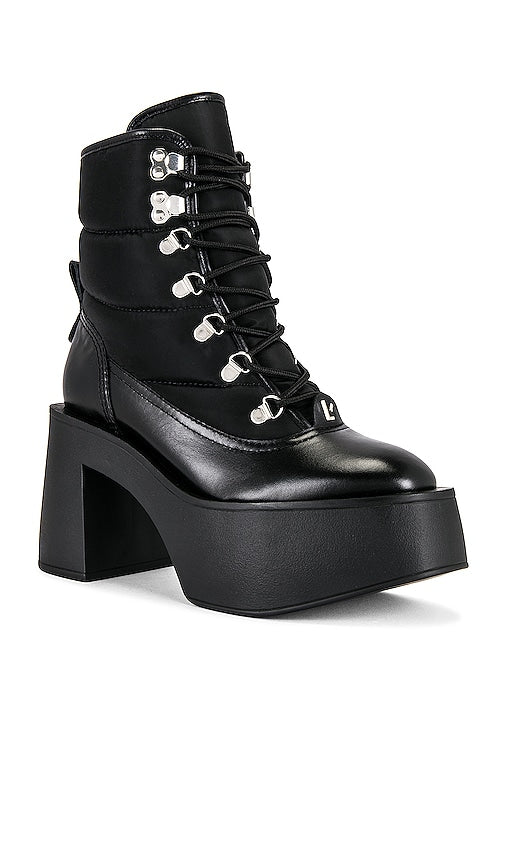Larroude Chamonix Boot in Black. - size 10 (also in 5.5, 7.5, 8.5, 9, 9.5) Larroude Chamonix Boot in Black. - size 10 (also in 5.5, 7.5, 8.5, 9, 9.5) Gabardine and leather upper with manmade sole. Made in Brazil. Lace-up front. Faux fur lining. Insole with memory foam cushion and hot stamp logo. Approx 100mm/ 4 inch heel Approx 57mm/ 2.25 inch platform Approx 159mm/ 6.25 inch shaft. LROU-WZ132. L237-CHAM-BLAC-0506. Founded by former Barneys Fashion Director Marina Larroude in 2020, Larroude is a new brand of footwear that believes fashion is here to bring sparkle and joy into our everyday lives. Designed for every woman, the collection of statement-making heels, boots, sandals, and slides never compromises on design, fit, and quality. Made with love in Brazil, Larroude works exclusively with partners that aim to reduce any environmental pollution. The leather components of each shoe follows sustainable practices and are Gold certified by the Leather Working Group. All packaging is made of 100% recyclable material to continue sustainable growth. Shop the latest in fashion from Larroude