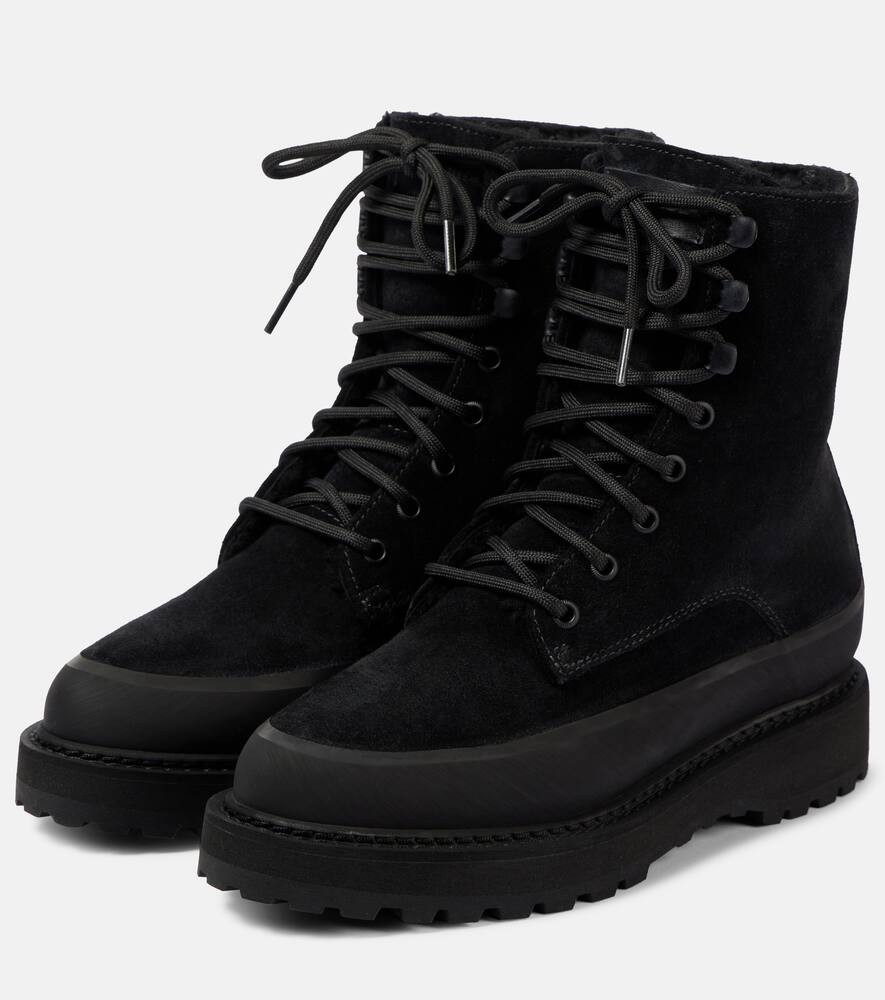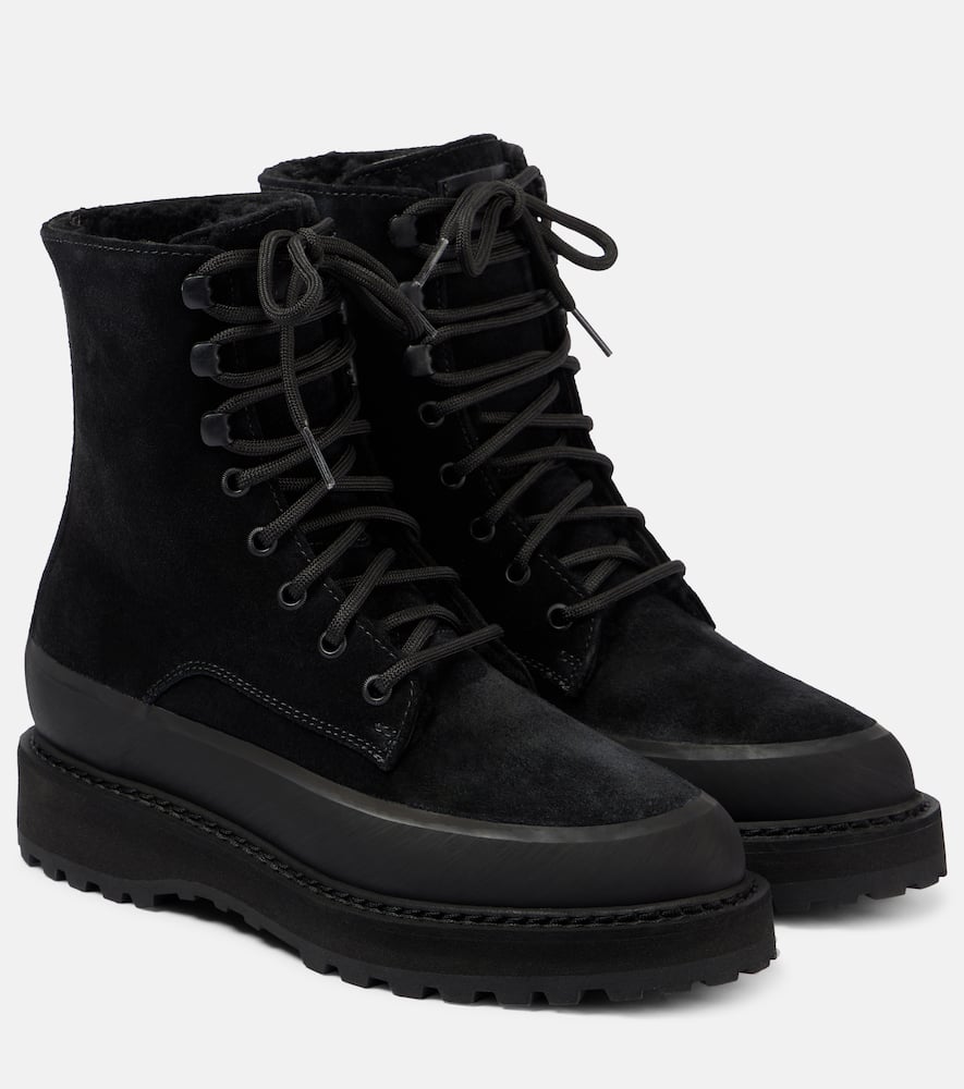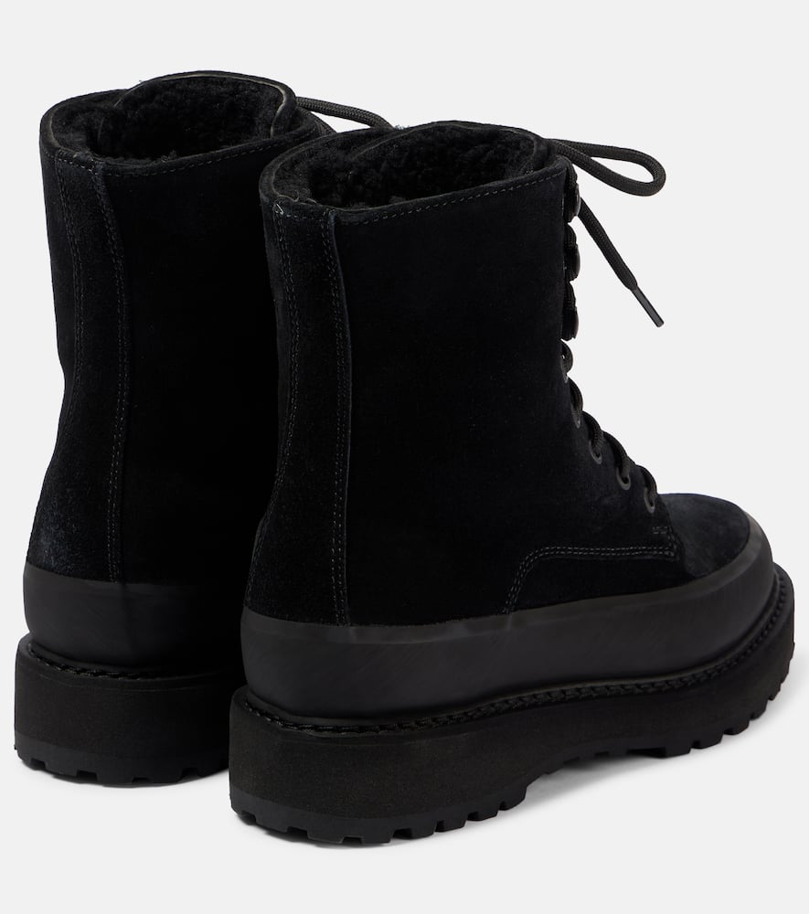 Upper: suede. Lining: shearling. Sole: leather insole, rubber sole. Toe shape: round toe. Made in Italy. Includes: shoe box, dust bag, extra laces. Designer color name: Black. Closure: lace-up. Shop the latest Le Monde Beryl Flat Boots for women now.